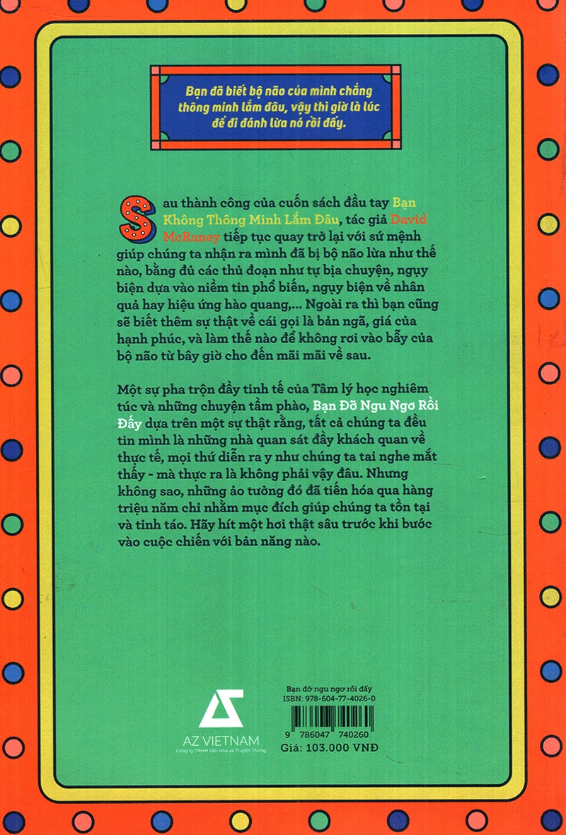 Sau thành công của cuốn sách tâm lý học gây chấn động năm 2017 Bạn Không Thông Minh Lắm Đâu, tác giả David McRaney sẽ quay trở lại với chúng ta trong năm nay với một tác phẩm nặng ký không kém – Bạn Đỡ Ngu Ngơ Rồi Đấy. Là một sự pha trộn đầy tinh tế giữa công cuộc nghiên cứu khoa học nghiêm túc và hàng tá những câu chuyện tầm phào, cuốn sách này sẽ một lần nữa lật tẩy những thủ đoạn tráo trở mà bộ não trong hộp sọ vẫn đang hàng ngày sử dụng để đánh lừa bạn.