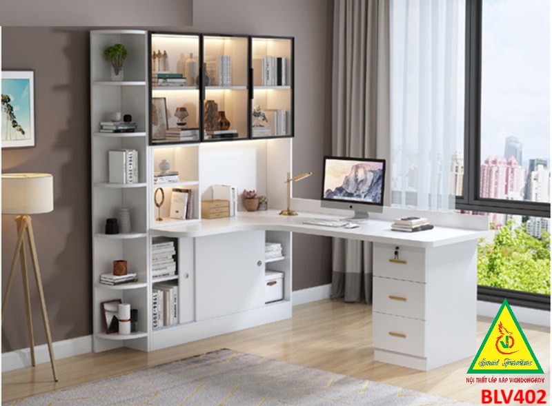 Bàn liền kệ kết hợp tủ trưng bày: Tận dụng không gian hiệu quả, tích hợp kệ sách, kệ tài liệu và tủ cánh kính trưng bày đồ decor, huy chương, mô hình, nước hoa...