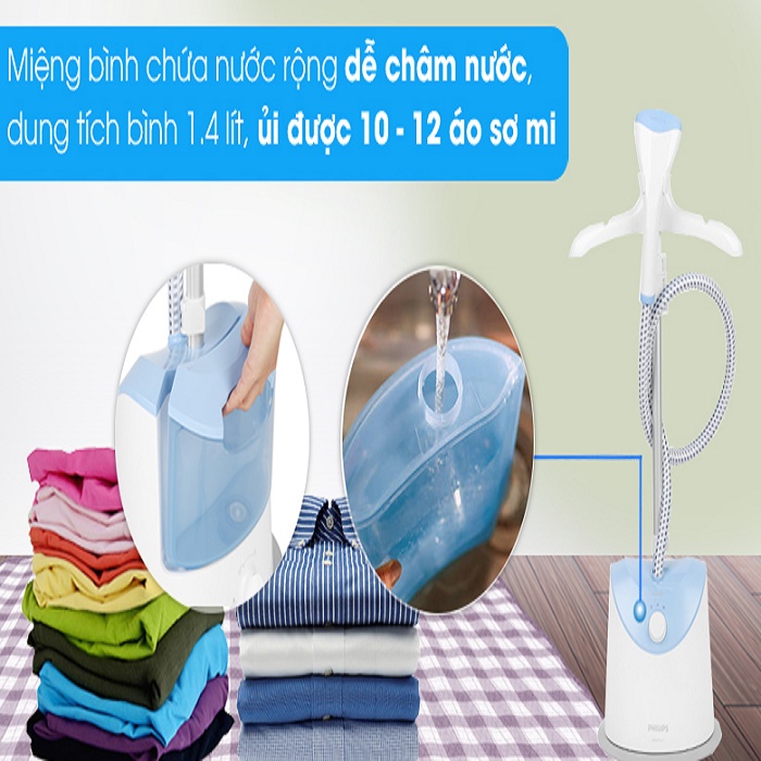 - Hữu hiệu trong việc ủi quần áoBàn ủi hơi nước đứng Philips GC482/29 có thiết kế bình chứa nước 1400 ml giúp chứa được nước nhiều hơn, hạn chế việc người dùng phải thay nước liên tục trong quá trình ủi, tiết kiệm thời gian xuống mức tối ư Bàn ủi hơi nước đứng Philips GC482/29 sử dụng móc treo quần áo giúp cố định quần áo trong quá trình ủi, kết hợp với khung trụ của bàn ủi có thể điều chỉnh lên xuống nhờ nút vặn giúp người dùng có thể chỉnh độ cao mong muốn.Trang bị công suất 1600W và 2 chế độ phun hơi nước khác nhau, giúp đa dạng hóa quá trình ủi, với mỗi chế độ phun hơi nước sẽ phù hợp với từng loại quần áo.