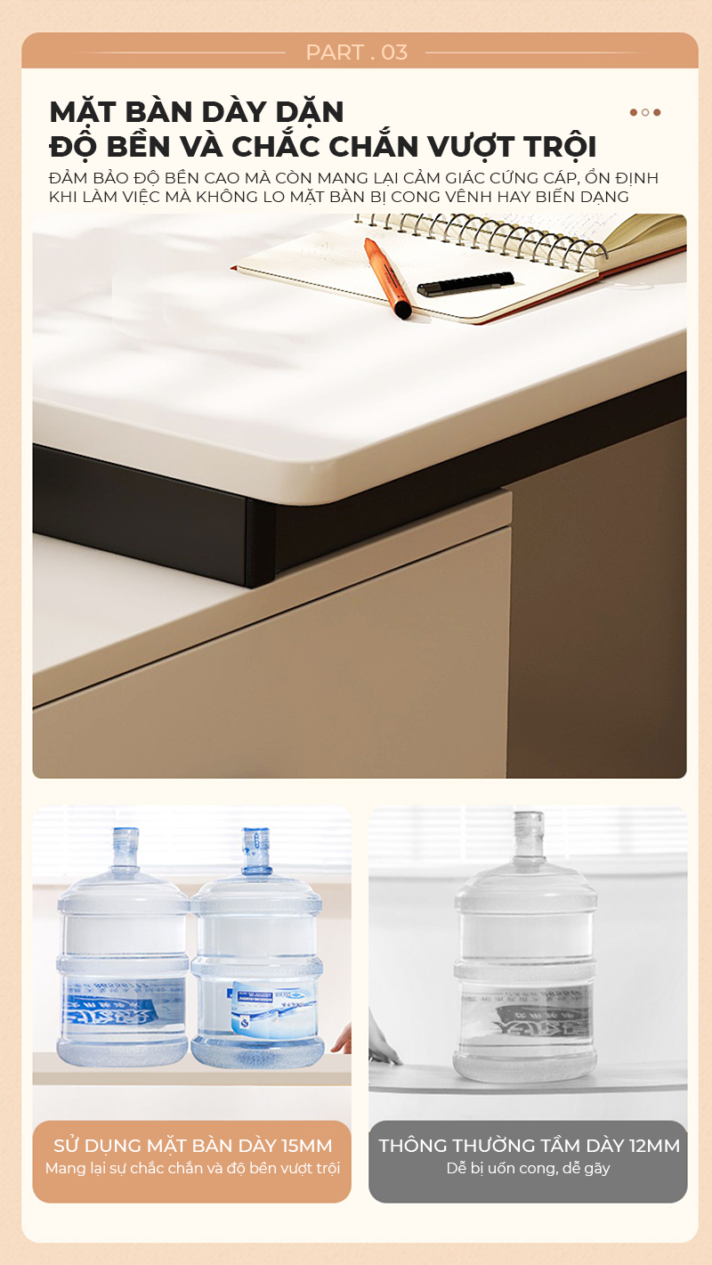 Chất liệu: Mặt bàn gỗ mdf dày 30mm phủ melamin chống xước - Khung thép chống gỉ phủ sơn tĩnh điện