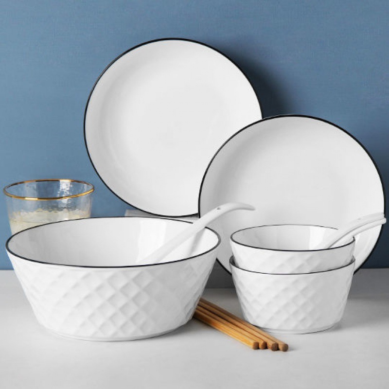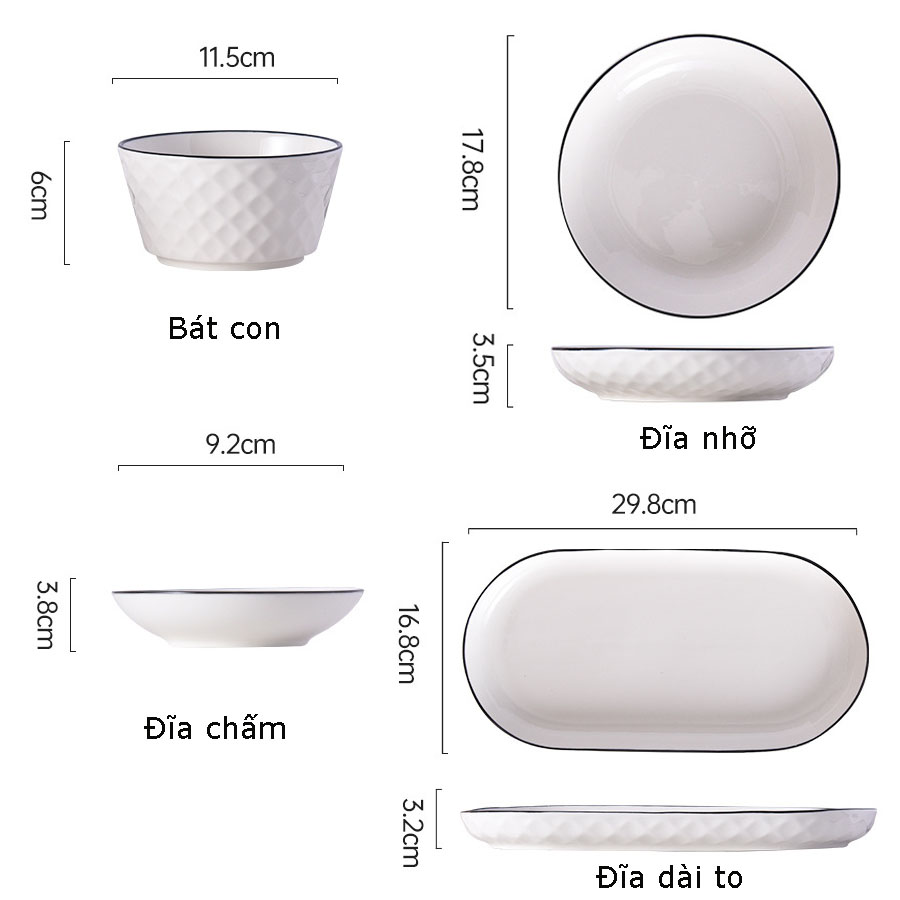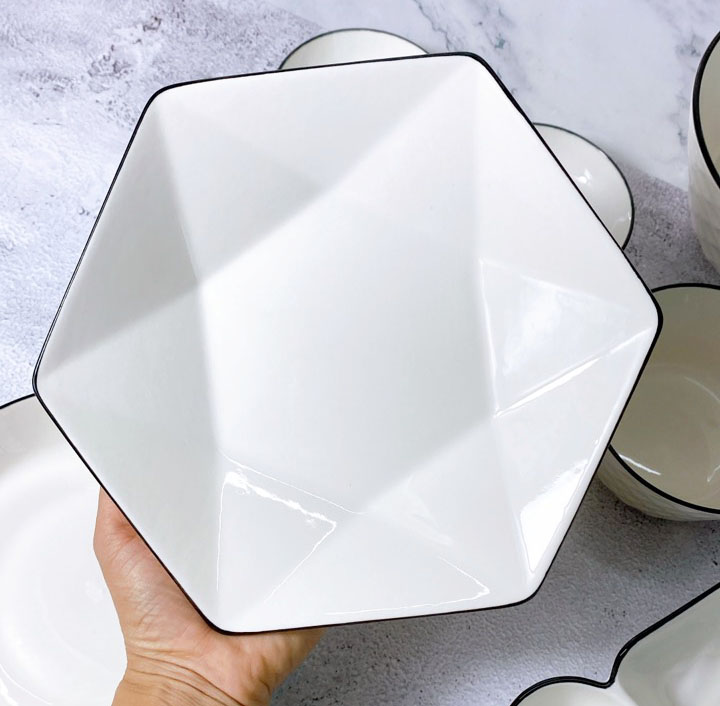 Bộ bát đĩa gốm sứ Gosu trắng cao cấp. Với họa tiết kim cương đơn giản viền đen sẽ làm không giảm bếp nhà bạn thêm phần bình yên, nhưng không kém phần sang trọng.