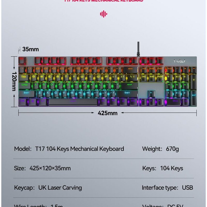 Mô tả sản phẩm Bàn Phím cơ T-Wolf T17, Blue Switch, USB, LED, 104 Gaming T-Wolf T17 Blue Switch là lựa chọn hoàn hảo cho những ai đang tìm kiếm một bàn phím cơ giá