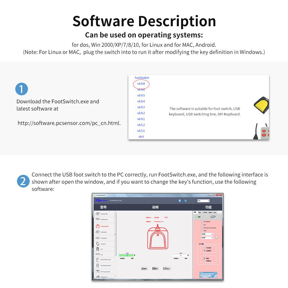 The USB foot switch is a custom function keyboard for one key or a few key, which can customize any key, key combination, hotkeys or shortcuts keys, and can be applied to medical devices, computers