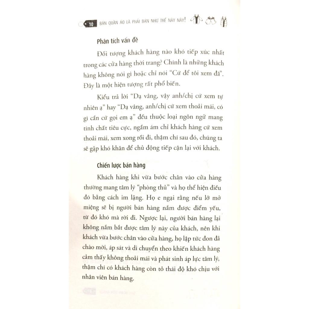 Bán quần áo là phải bán như thế này này! là cuốn sách chứa đựng nhiều điều khác biệt so với các tài liệu hướng dẫn thường thấy. Cuốn sách mô tả một cách toàn diện việc kinh doanh trong lĩnh vưc thời trang với các chiến lược bán hàng cụ thể, thực tế, có tính thực tế rất cao khi áp dụng vào việc đào tạo nhân viên. Cuốn sách kinh doanh này đồng thời cũng đưa ra những hướng dẫn, gợi ý, các mẫu câu sử dụng phù hợp với ngữ cảnh giúp việc trao đổi với khách hàng trở nên gần gũi thuyết phục.