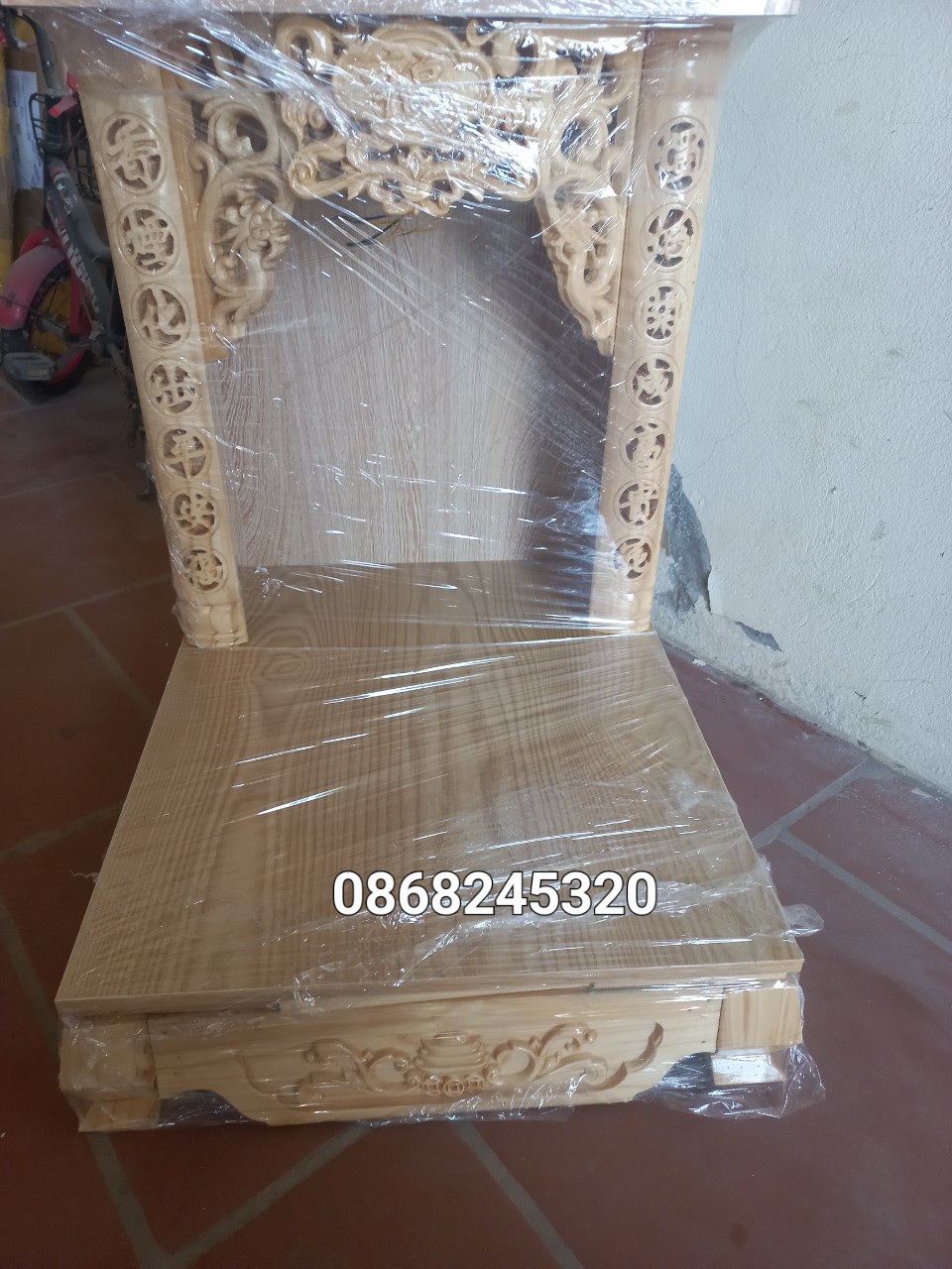 _ Bộ bàn thờ chung cư được làm bằng chất liệu gỗ sồi tự nhiên 100% _ Kích thước bàn thờ 69×48cm × ám khói khung gỗ sồi 31×41cm + chữ phúc hay hoa văn