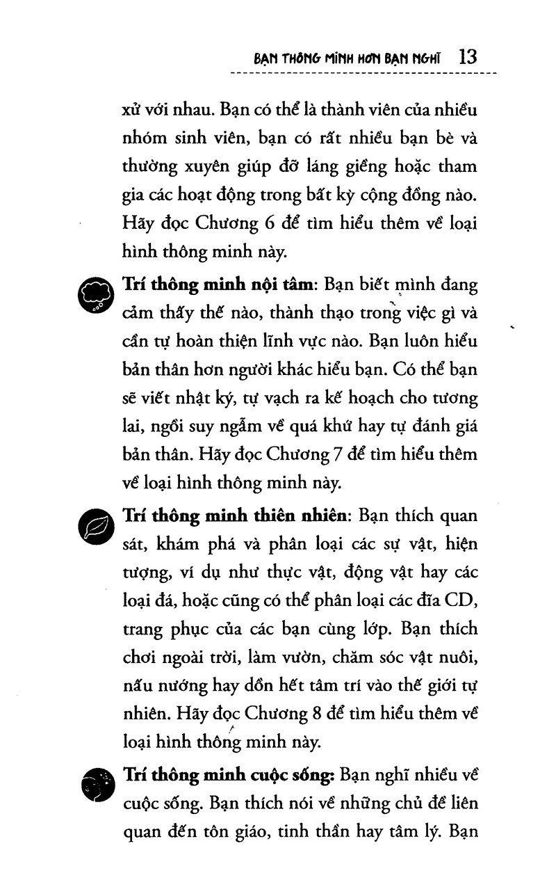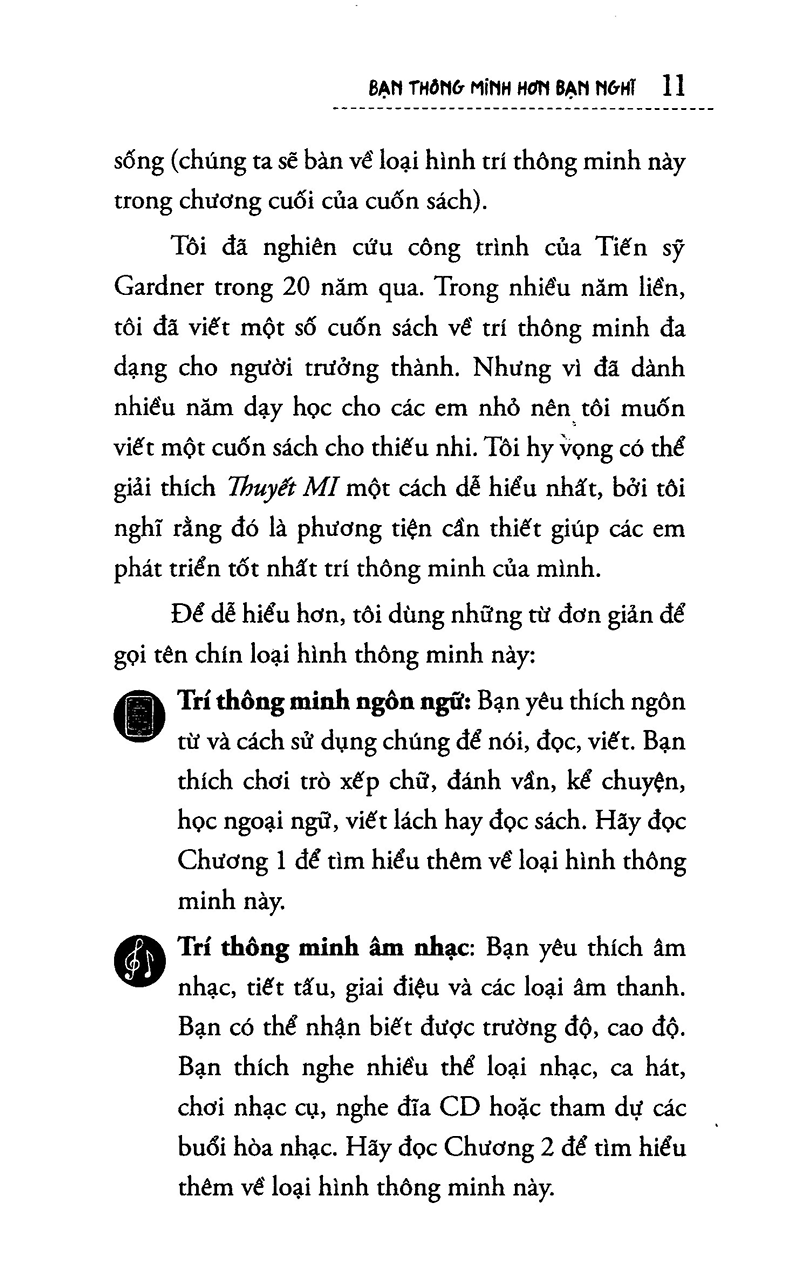 Bạn Thông Minh Hơn Bạn Nghĩ Bạn có nghĩ mình thông minh không? Và trí thông minh là gì? Nhiều người tin rằng thông minh là phải đạt điểm tốt hoặc giành thứ hạng cao ở trường học. Hoặc thông minh là làm được những việc như: Đọc thật tốt Giải toán nhanh Học thuộc lòng giỏi Những điều này có thể khiến bạn ngạc nhiên bởi trí thông minh có thể biểu hiện theo nhiều cách thức khác nhau – trong nghệ thuật, âm nhạc, thể thao, trong cách cảm nhận, sự hiểu biết về thiên nhiên và sống hòa hợp với những người xung Bạn thông minh hơn bạn nghĩ sẽ giúp bạn khám phá ra rằng có vô vàn cách biểu hiện trí thông minh. Trong gần một thế kỷ qua, giới chuyên môn vẫn sử dụng các bài kiểm tra IQ để đo chỉ số thông minh. IQ là từ viết tắt của Intelligence Quotient, là thước đo trí thông minh của con người thông qua một bài kiểm tra. Bài kiểm tra này yêu cầu bạn phải giải toán, định nghĩa từ, tạo mẫu thiết kế, nhắc lại các con số theo trí nhớ và một số bài tập khác nữa. Có thể bạn cũng từng làm một bài kiểm tra IQ giống như vậy. Nhiều người nghĩ rằng kiểm tra chỉ số IQ là cách tốt nhất để đo trí thông minh của con người. Tuy nhiên, kiểm tra IQ không phải là cách hoàn hảo vì có rất nhiều thứ không thể phản ánh qua các bài kiểm tra. Chúng không thể dự đoán được khi trưởng thành bạn sẽ làm gì hoặc trở thành người như thế nào. Và các câu hỏi kiểm tra cũng thường chịu ảnh hưởng bởi định kiến hoặc quan điểm của người ra đề. Bên cạnh đó, không có bài kiểm tra nào là toàn diện. Hệ thống câu hỏi thường không thể làm bộc lộ những khả năng khác nhau của bạn. Nói chung, các bài kiểm tra IQ thường chú trọng từ ngữ hoặc các con số, vì vậy sẽ làm xao lãng những thứ quan trọng khác như khả năng âm nhạc, nghệ thuật, tự nhiên hay xã hội. Thời gian gần đây, nhiều nhà nghiên cứu nghi ngờ quan điểm cho rằng kiểm tra IQ là thước đo trí thông minh tốt nhất. Một trong số đó là nhà tâm lý học, Tiến sỹ Howard Gardner thuộc Đại học Harvard. Những công trình nghiên cứu của ông đã đưa ra một cái nhìn hoàn toàn mới về vấn đề “Thế nào là thông minh?”