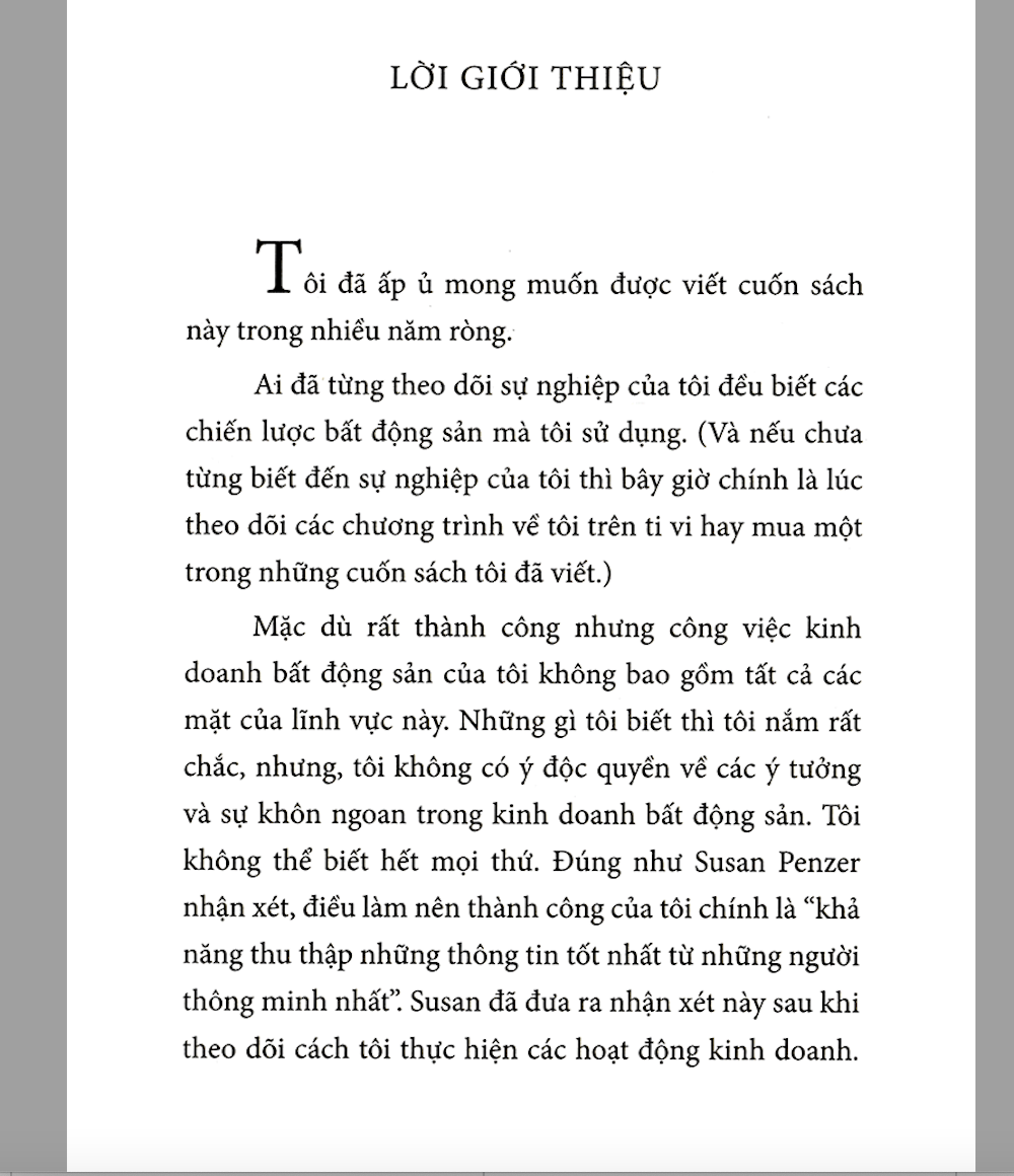 Susan đã đưa ra nhận xét này sau khi theo dõi cách tôi thực hiện các hoạt động kinh doanh. Và nhận xét đó cũng đúng với những gì tôi thực hiện trong cuốn sách này, đó là thu thập những thông tin hay nhất từ những người thông minh nhất trong lĩnh vực bất động sản. Họ chia sẻ những kinh nghiệm và những bài học mà họ đã học được từ người khác cũng như từ những sai lầm họ đã mắc.