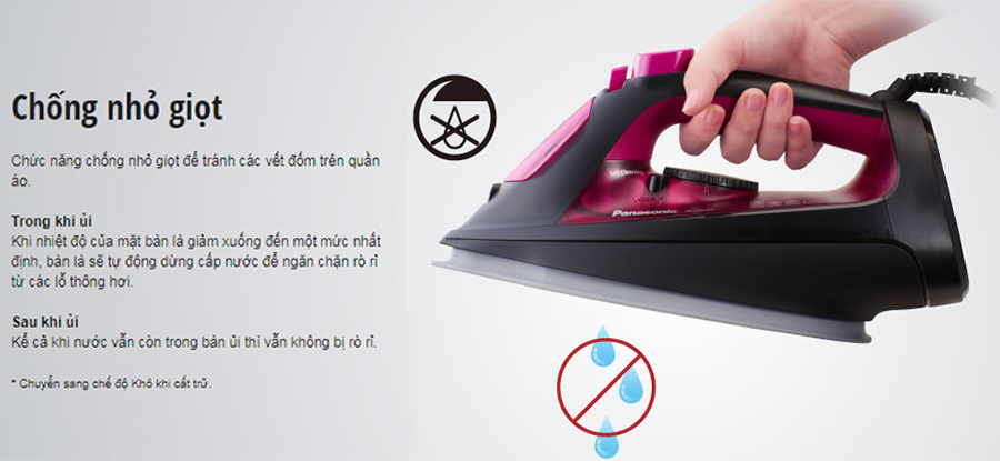 Bàn ủi Panasonic có chức năng chống nhỏ giọt và chế độ chống cặn, giúp ngăn không cho nước rò rỉ ra ngoài, không làm ố vàng quần áo, bằng cách khi nhiệt độ của bàn ủi giảm xuống đến một mức nhất định, bàn là sẽ tự động cấp nước để ngăn chặn rò rỉ từ các lỗ thông hơi. Và khả năng tự làm sạch thông minh, chỉ bằng 1 nút nhấn sẽ tự động tháo nước trong khoang chứa nước để làm sạch ngay lập tức.