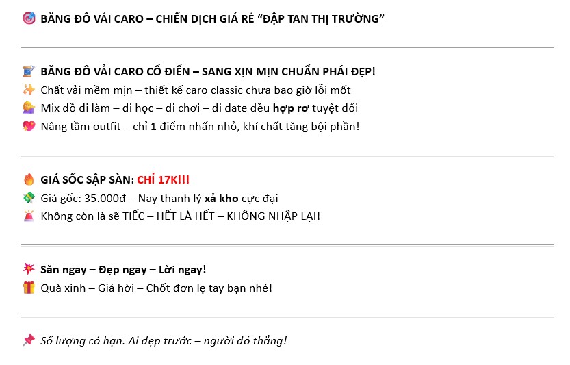 Mua tại TiktokBĂNG ĐÔ VẢI CARO – CHIẾN DỊCH GIÁ RẺ “ĐẬP TAN THỊ TRƯỜNG” BĂNG ĐÔ VẢI CARO CỔ ĐIỂN – SANG XỊN MỊN CHUẨN PHÁI ĐẸP! Chất vải mềm mịn – thiết kế caro classic chưa bao giờ lỗi mốt Mix đồ đi làm – đi học – đi chơi – đi date đều hợp rơ tuyệt đối Nâng tầm outfit – chỉ 1 điểm nhấn nhỏ, khí chất tăng bội phần! GIÁ SỐC SẬP SÀN: CHỈ 17K!!! Giá gốc: 35.000đ – Nay thanh lý xả kho cực đại Không còn là sẽ TIẾC – HẾT LÀ HẾT – KHÔNG NHẬP LẠI! Săn ngay – Đẹp ngay – Lời ngay! Quà xinh – Giá hời – Chốt đơn lẹ tay bạn nhé! Số lượng có hạn. Ai đẹp trước – người đó thắng! Sản phẩm này là tài sản cá nhân được bán bởi Nhà Bán Hàng Cá Nhân và không thuộc đối tượng phải chịu thuế GTGT. Do đó hoá đơn VAT không được cung cấp trong trường hợp này.