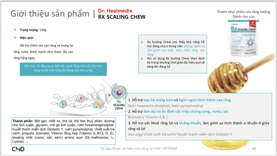 Bánh gặm tốt cho răng Dr.Healmedix Rx Scaling Chew - thanh nhai phòng bệnh răng miệng,loại bỏ mảng bám Rx Scaling Chew cho thấy khả năng hỗ trợ đáng chú ý trong việc phòng ngừa và làm giảm tưa lưỡi, viêm chân răng, cao răng mang lại răng nướu khoẻ mạnh như được lấy cao răng hằng ngày. Cấu trúc 20 khía đều 360 độ, quét tổng thể các cấu trúc răng và bề mặt răng đa dạng của thú cưng. Khi sử dụng Rx Scaling Chew theo định kỳ trong khoảng thời gian dài hiệu quả sẽ tăng lên đáng kể Thành phần: Bột gạo, chất xơ, thịt cá, thịt lợn thuỷ phân, đường nho tinh luyện, glycerin, mỡ gà tinh luyện, natri hexametaphotphat, huyết thanh miễn dịch Globolin Y, natri pyrophotphat, chiết xuất trà xanh, propolis, bromelin, Vitamin tổng hợp (Vitamin A, B12, D, E), khoáng chất (canxi, sắt, kẽm) amino acid (DL-methionine, L-Lysine), chất bảo quản.