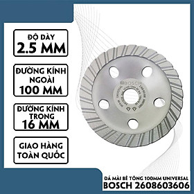 Đường kính ngoài: 100mm Xuất xứ Trung Quốc Hãng sản xuất Bosch Công nghệ Đức Độ dày: 6mm Đường kính trong: 16mm Ưu điểm: - Được làm từ vật liệu cao cấp có tính
