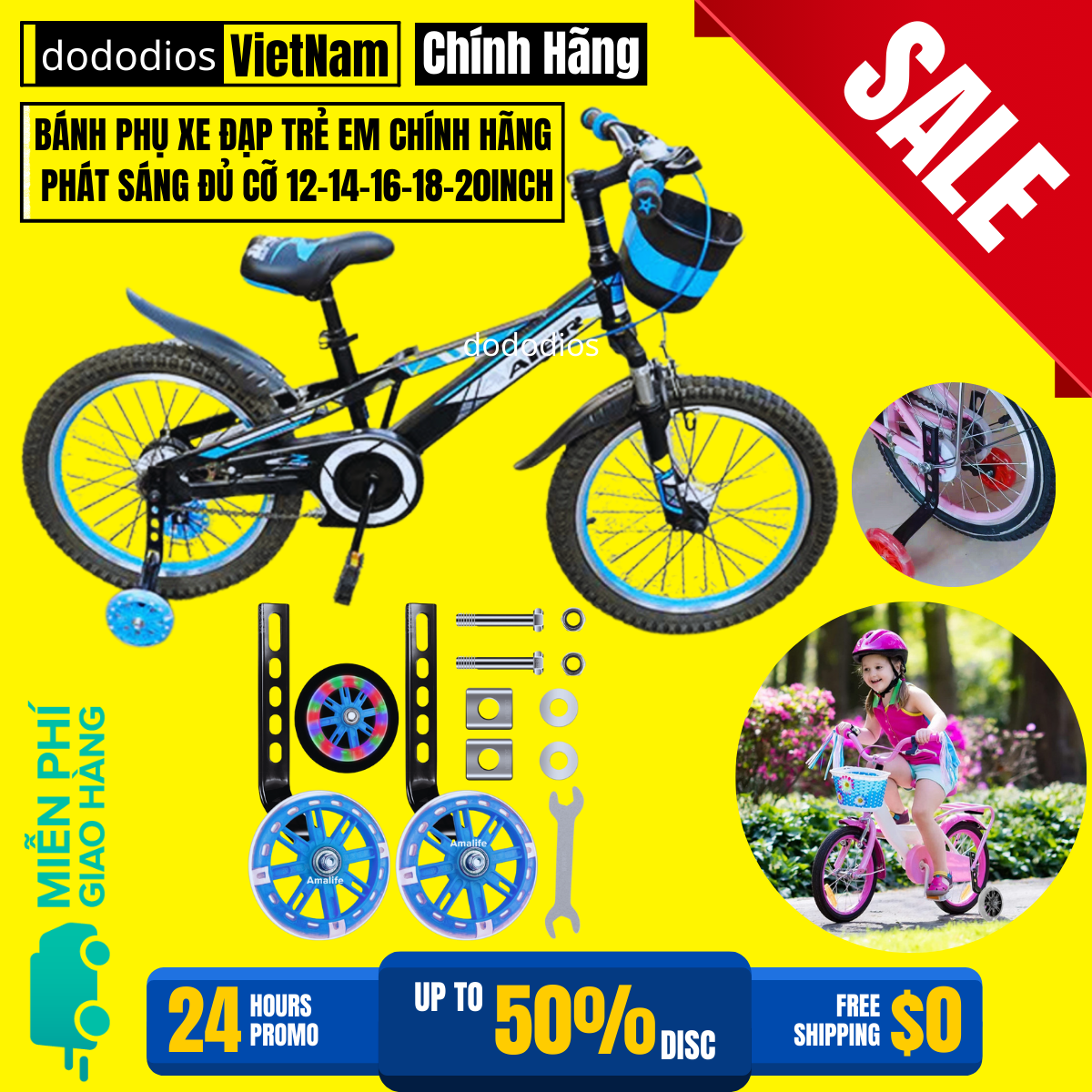 Bánh Phụ Xe Đạp Trẻ Em Phát Sáng Cân Bằng Chắc Chắn Dành Cho Các Bánh Xe Size 12 14 16 18 20inch Chính Hãng dododios ------- - Tên sản phẩm: Bánh phụ xe đạp