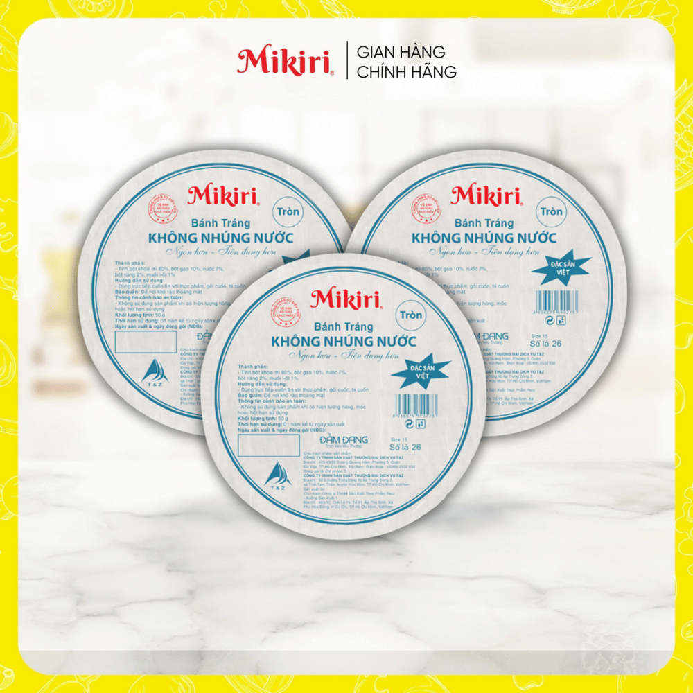 Mua tại TiktokBánh tráng tròn Mikiri không nhúng nước size lớn nhỏ - tiện lợi - ăn liền Combo lựa chọn Với thành phần của bánh tráng gồm: tinh bột, khoai mì và muối. Dùng làm gỏi cuốn, bì cuốn. Không phải nhúng nước khi sử dụng, lá bánh mềm và dẻo.