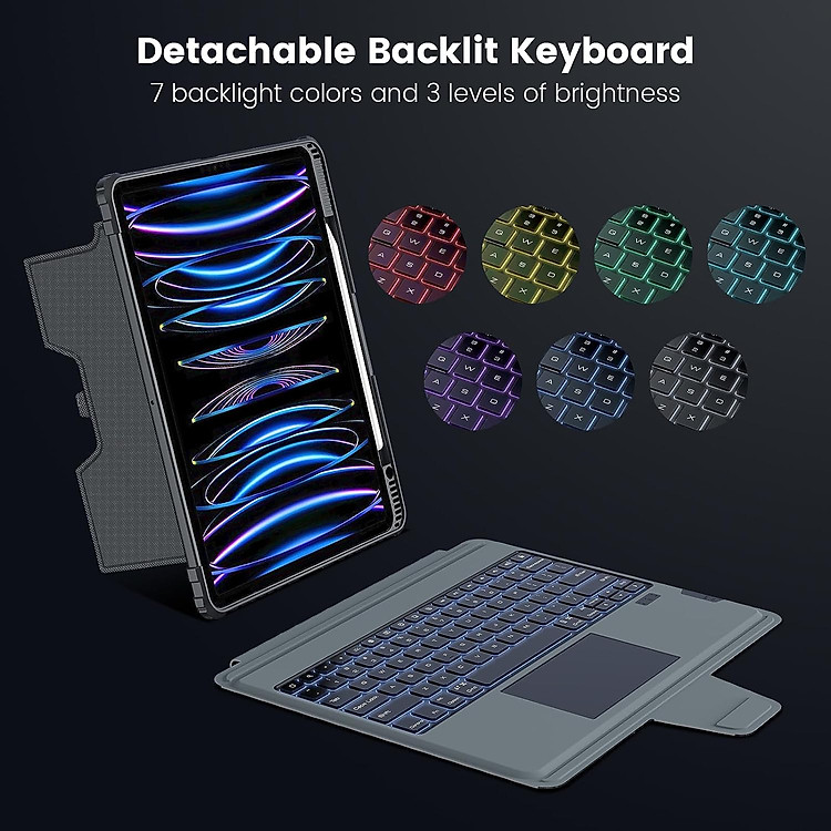 - Chuyển đến cài đặt kết nối Buetooth trên iPad của bạn, tìm Bàn phím Buetooth. Nhấn "FN+N" để BẬT/TẮT bàn di chuột, để tránh chạm nhầm vào bàn di chuột. Bumper Combo Keyboard Case là hộp đựng bàn phím đa chức năng dành riêng cho iPad Pro, có giá đỡ có thể điều chỉnh, bàn phím có thể tháo rời và bàn di chuột giúp thuận tiện khi nhập, xem, đọc và phác thảo. Đồng thời cho phép bạn tận hưởng trải nghiệm hoạt động linh hoạt. Vỏ chống rơi cấp quân sự được sử dụng bao bọc chặt chẽ xung quanh các cạnh của iPad, cung cấp khả năng bảo vệ toàn bộ xung quanh. Thiết kế nắp trượt máy ảnh đã được cấp bằng sáng chế giúp bảo vệ máy ảnh của iPad khỏi mài mòn và trầy xước một cách hiệu quả. Chất liệu vải PU ngắn gọn và tinh tế hòa quyện với tính thẩm mỹ của iPad, một sự tích hợp hoàn hảo của nghệ thuật và công nghệ. [Bàn phím có đèn nền & Bàn di chuột công nghệ chống chạm nhầm] Vỏ iPad với bàn phím có đèn nền 7 màu và 3 mức điều chỉnh độ sáng, bạn có thể dễ dàng sử dụng iPad ngay cả trong môi trường tối. Yên tĩnh và thoải mái khi gõ và bàn di chuột có độ nhạy cao tích hợp để cuộn, vuốt, Với bàn di chuột công nghệ chống chạm nhầm, bạn có thể tạm biệt sự phiền nhiễu của con trỏ khi gõ phím. [Tự động tắt/mở và pin dung lượng cao] Sau 2-3 giờ sạc đầy, vỏ bàn phím iPad ở chế độ chờ trong 180 ngày. Khi bạn đóng hộp đựng bàn phím iPad 10 phút không hoạt động, bàn phím sẽ ở chế độ ngủ.