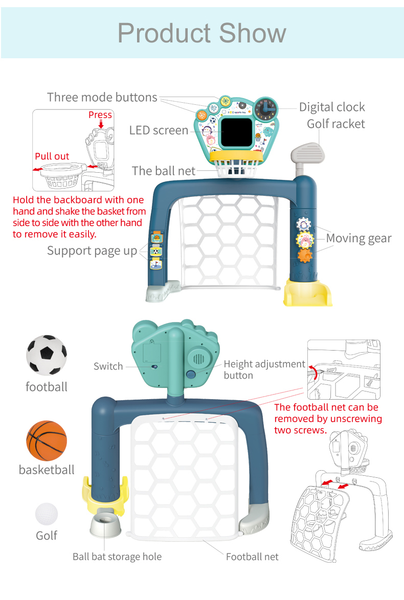 Bộ đồ chơi mô phỏng vận động siêu vui tích hợp 3 môn: bóng đá, bóng rổ và golf mini, giúp bé: Rèn thể lực và kỹ năng phối hợp nhóm. Phát triển phản xạ