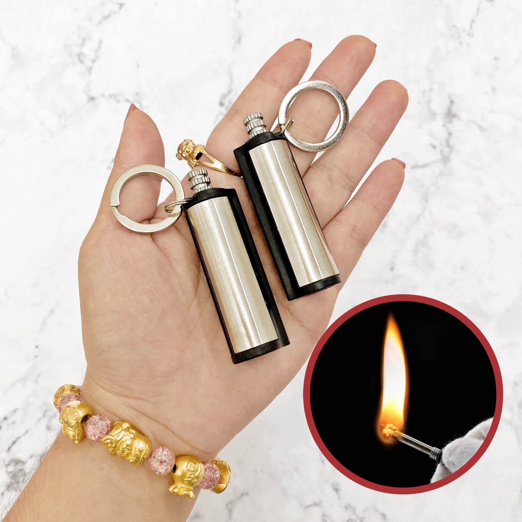 Hột quẹt bật lửa móc khóa diêm xăng sinh tồn hình Trụ Tròn - xài xăng - Nguyên liệu: kim loại nguyên khối – Kích thước: Chiều cao: 5 cm, Chiều rộng: 1.3 cm –