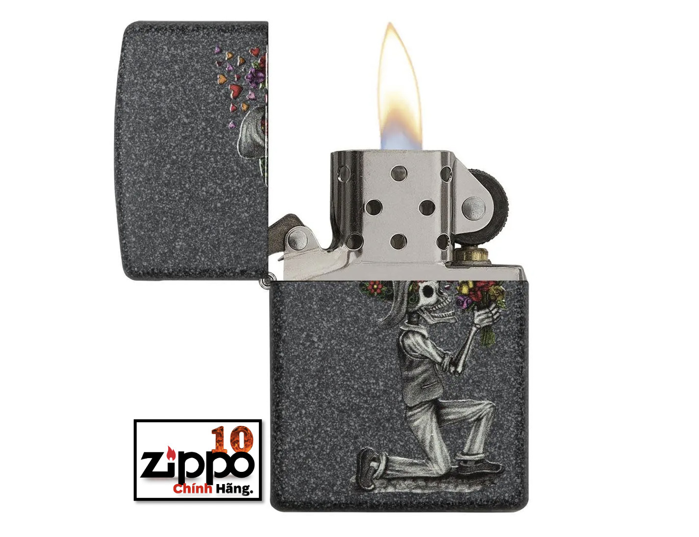 Cái chết không thể ngăn được tình yêu đích thực. Bộ hai chiếc bật lửa chống gió Iron Stone này ghi lại câu chuyện tình yêu lãng mạn. Được đóng gói trong một hộp đựng dạng quà tặng. Để tối ưu hiệu suất, hãy dùng nhiên liệu bật lửa của Zippo.