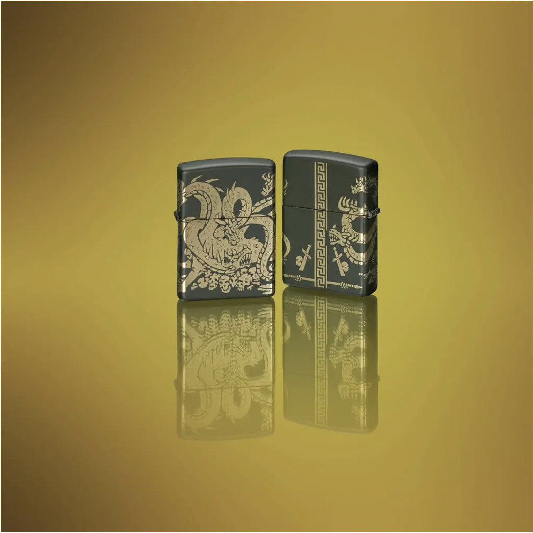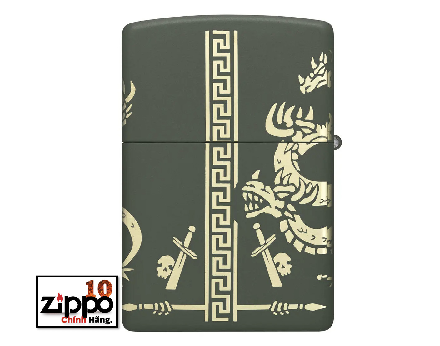 Mẫu Green Matte mạnh mẽ này đánh dấu sự ra mắt của phương pháp khắc Laser 360° sắc nét và chính xác trên các mẫu đế mờ đặc trưng của chúng tôi – một phương pháp xử lý trước đây chỉ dành riêng cho bề mặt trước. Tác phẩm được chỉ huy bởi một con rồng nhiều đầu trên đỉnh tàn tích của những kẻ thách thức nó, được mô tả bằng tông màu đồng sáng bóng. Được đóng gói trong một hộp đựng dạng quà tặng. Để tối ưu hiệu suất, hãy dùng nhiên liệu bật lửa của Zippo.