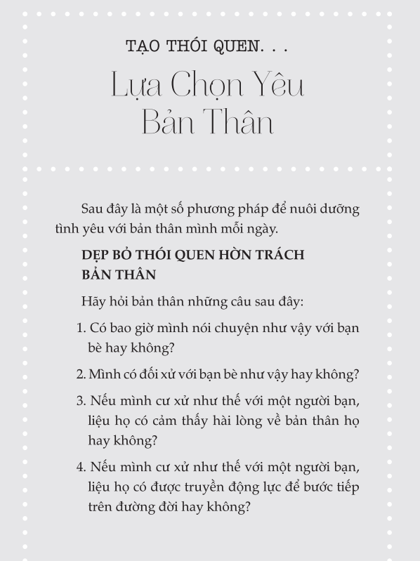 Ở cuối mỗi chương, bạn sẽ tìm thấy một trang phụ có tiêu đề “Tạo Thói Quen...". Đây là nơi để chúng ta thực hành những bài học và khám phá những cách thức dẫn truyền năng lượng tích cực vào cuộc sống thường nhật. Sau khi dành thời gian soi chiếu vào nội tâm trong lúc đọc những chương này, đồng thời đã xác định những phương diện nào của cuộc sống cần thay đổi, hãy vận dụng những phần tổng kết để tập trung năng lượng vào việc tạo ra sự khác biệt đích thực.