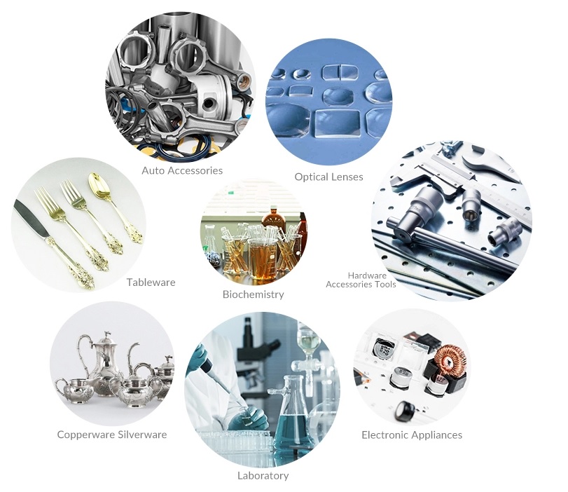 Danh mục ứng dụng của Máy rửa siêu âm vào trong sản xuất, công nghiệp và dân dụng chẳng bao dừng lại cả. Các vật không xốp và có thể nhúng được vào nước hoặc dung môi đều có thể làm sạch bằng phương pháp này. Sau đây là các ứng dụng điển hình của phương pháp rửa bằng sóng siêu âm: