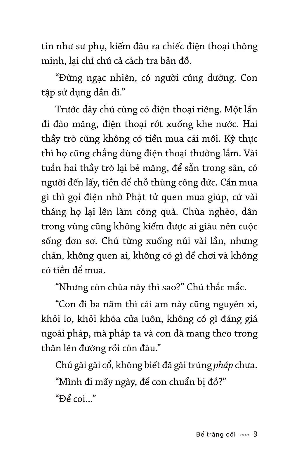 Trên trời là vầng trăng lẻ, dưới đất là người cút côi. Theo chân những con người cút côi đó, tác phẩm vẽ ra hành trình tầm đạo của hai thầy trò thời hiện tại xuống núi “nhập thế” gặp phải trận đại dịch. Song song là chuyến đi được hư cấu hoá về thầy Trần Huyền Trang ở Đại Đường xa xưa vượt bao gian khổ hòng thỉnh được chân kinh. Họ như vầng trăng côi lang thang trên trời đất, bất tử với thời gian.