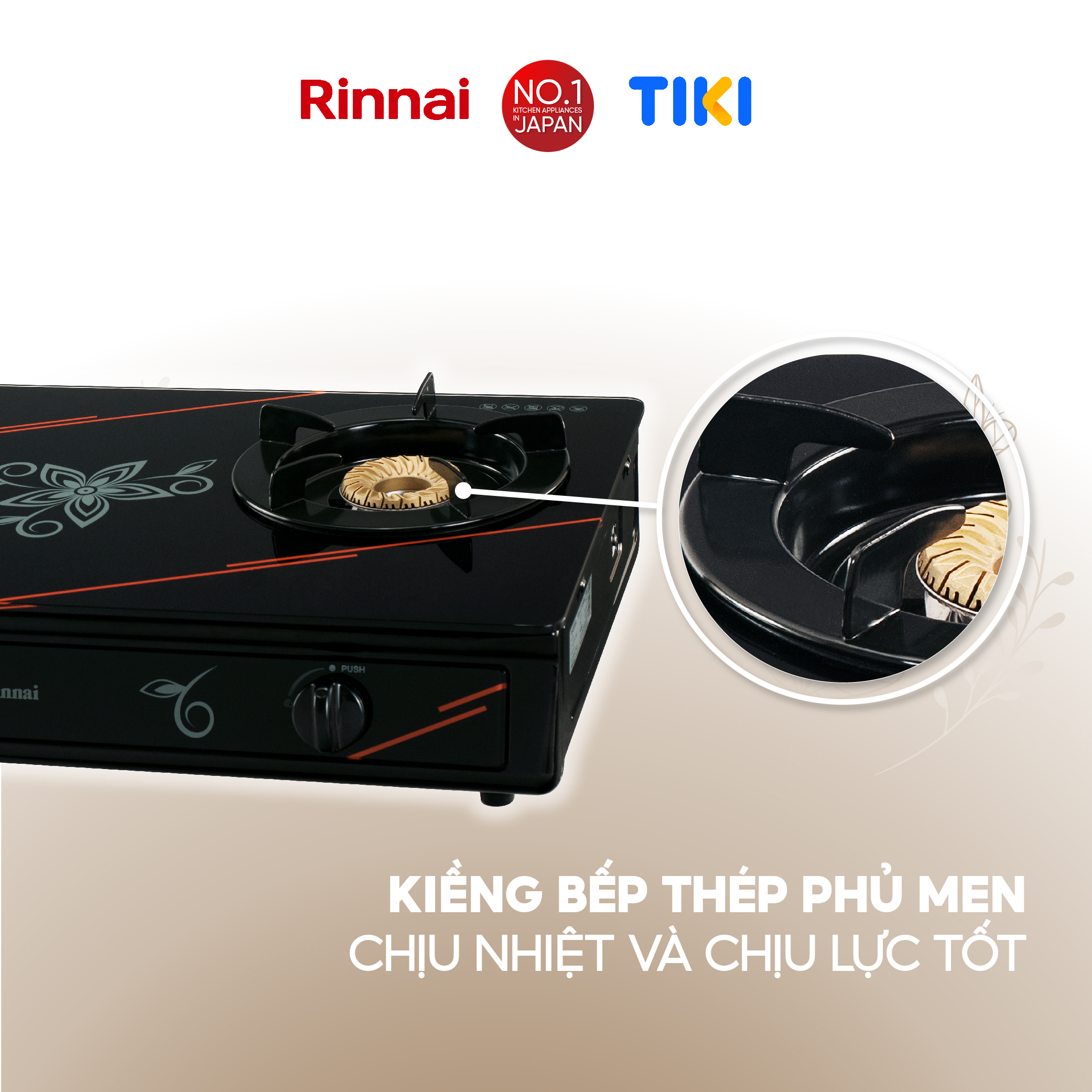 * Mặt kiếng cao cấp chịu lực, chịu nhiệt, thiết kế hoa văn sang trọng; - Thân bếp làm bằng inox chống rỉ sét, cao 60mm; - Núm vặn kiểu Rinnai; - Kiềng thép sơn