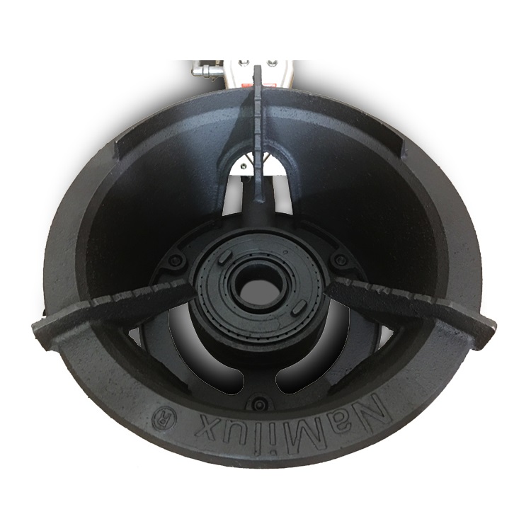 Đầu đốt của bếp khè công nghiệp Namilux bằng gang nguyên khối với các lỗ thoát ga xếp đều chia làm 2 vòng làm cho ngọn lửa tỏa đều khắp đáy nồi, gia tăng nhiệt độ nhanh hơn, nấu chín thức ăn nhanh và tiết kiệm ga