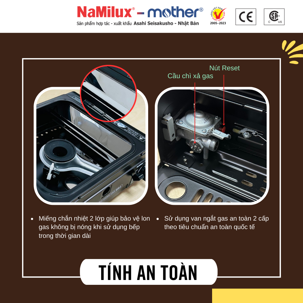 ⮚ Sử dụng van ngắt gas an toàn 2 cấp theo tiêu chuẩn an toàn quốc tế. Miếng chắn nhiệt 2 lớp giúp bảo vệ lon gas không bị nóng khi sử dụng bếp trong thời gian dài