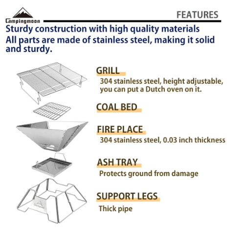 MÔ TẢ SẢN PHẨM BẾP NƯỚNG THAN HOA GẤP GỌN CHO 5-8 NGƯỜI CAMPINGMOON MT-3 * THÔNG TIN SẢN PHẨM: - Thương hiệu: Campingmoon - Mã sản phẩm: MT-3 - Chất liệu: stainless steel, iron