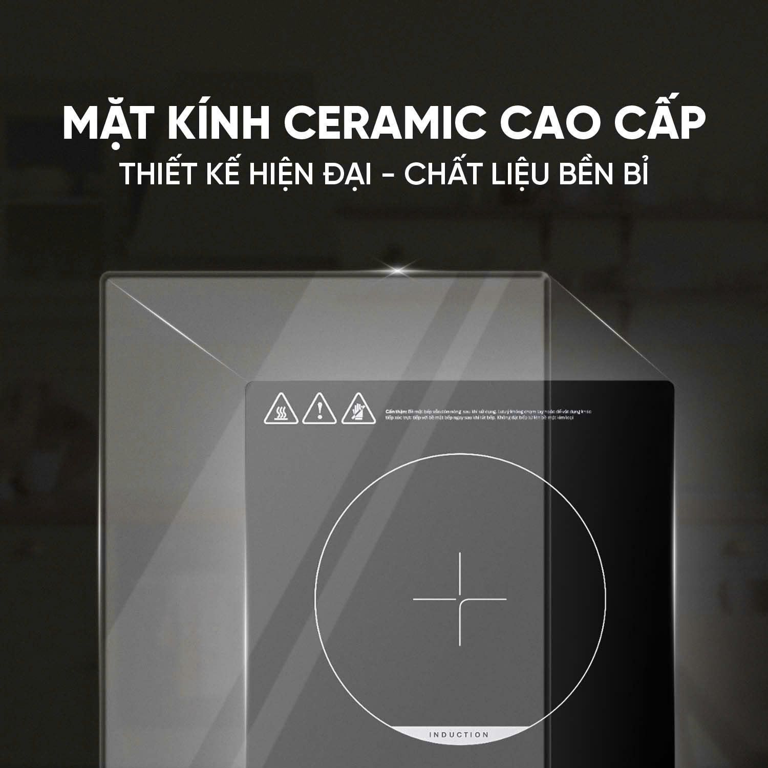Bếp được trang bị mặt kính Ceramic cao cấp, có khả năng chịu lực và chịu nhiệt vượt trội, giúp chống trầy xước và dễ dàng vệ sinh sau mỗi lần sử dụng. Thiết kế tối giản, gọn gàng với bảng điều khiển cảm ứng cùng màn hình LED sắc nét, mang lại vẻ tinh tế cho mọi không gian bếp.