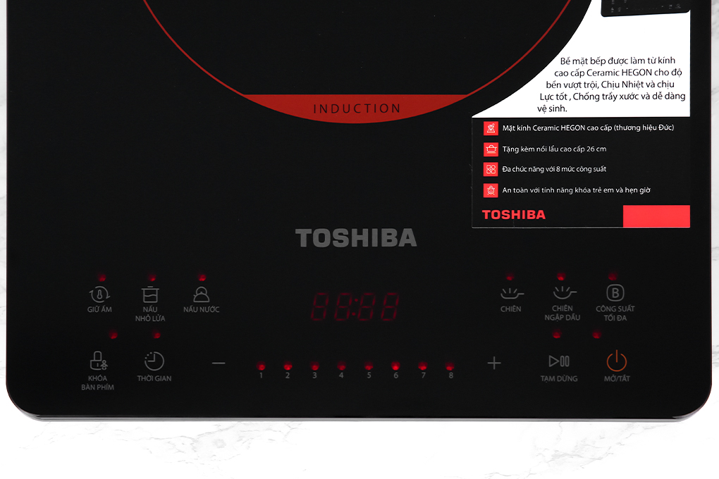 Bếp từ Toshiba IC-20S1PV sở hữu thiết kế thanh lịch với gam màu đen, các chi tiết màu trắng, vòng nhiệt màu đỏ sáng bắt mắt