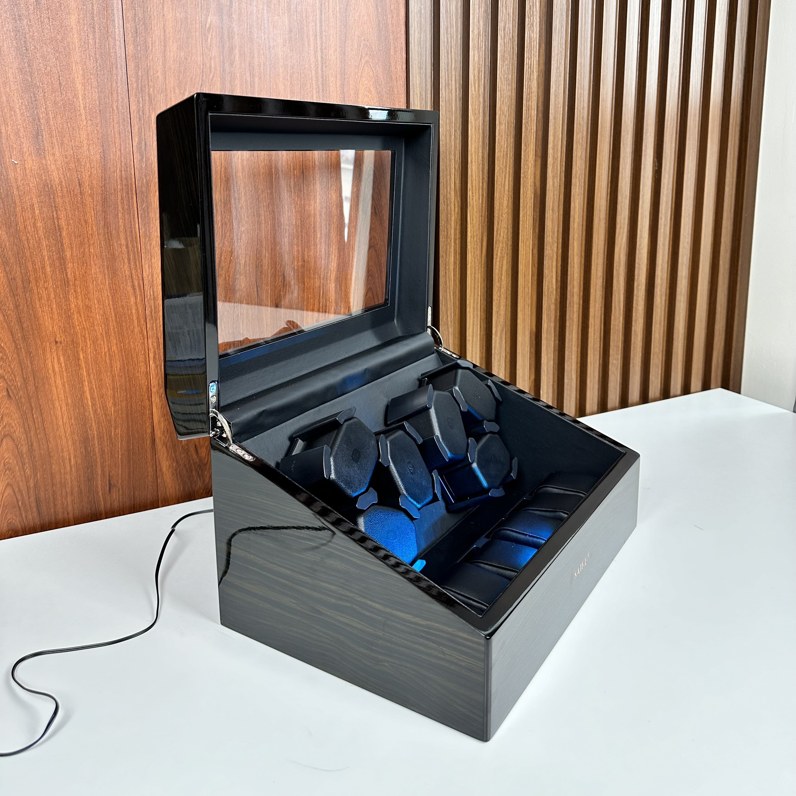 Hộp Đồng Hồ Cơ 6 Xoay + 6 Tĩnh SAIKE Vỏ Gỗ Sơn Vân Gỗ Mun Có Đèn Led