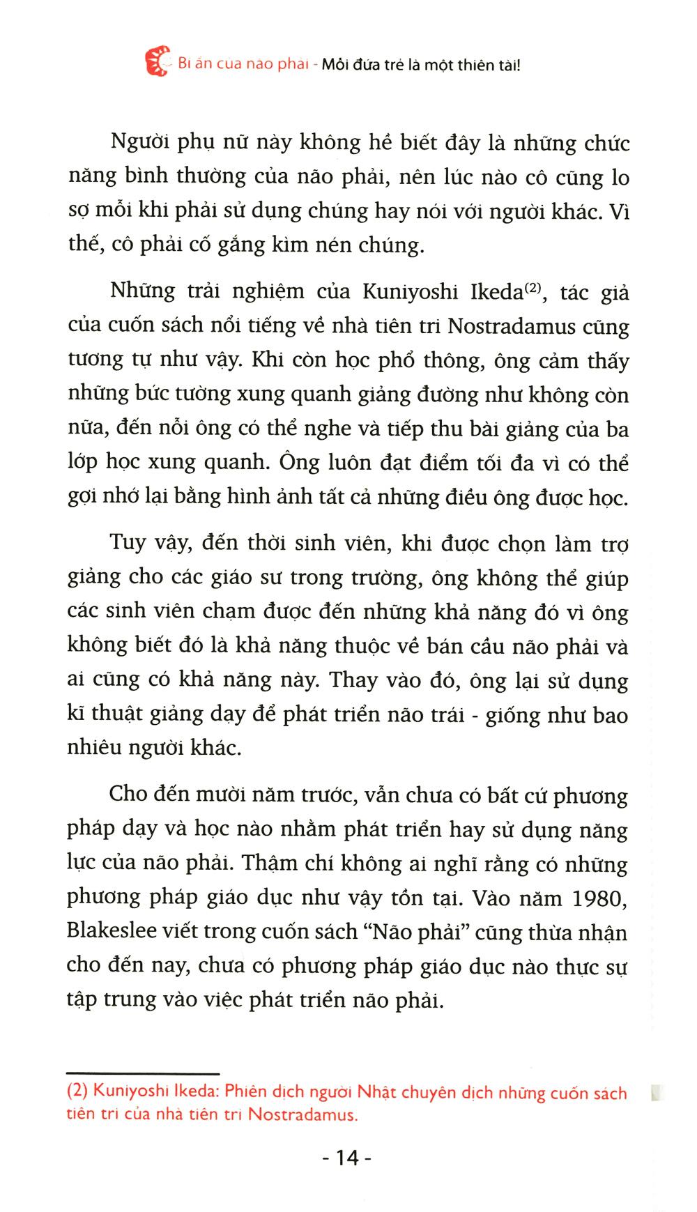 Cuốn sách đem đến triết lí giáo dục lành mạnh, nhân văn, coi trọng và tôn vinh mọi đứa trẻ. Nó cũng thức tỉnh cha mẹ Việt tận dụng những năm tháng đầu đời - khoảng thời gian duy nhất chúng ta có thể nắm tay trẻ - để quan tâm hơn đến việc nuôi dạy và giúp con có nền tảng phát triển tốt nhất. Không phải việc giáo dục bằng não phải theo phương pháp Shichida mang lại cho bạn một đứa trẻ thiên tài, mà luôn luôn có một thiên tài trong mỗi đứa trẻ nếu chúng ta biết cách kích thích não phải đúng cách.