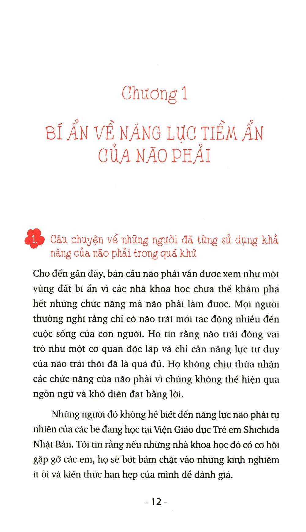 Bằng cách kết hợp sức mạnh của não trái, Phương pháp Shichida hướng đến mục tiêu khơi dậy khả năng của trẻ một cách cân bằng được gọi là “giáo dục não toàn diện”. Những khả năng như “cảm hứng” và “sáng tạo” được điều khiển bởi những chức năng của não phải. Não phải tư duy bằng hình ảnh và có khả năng nhớ những gì chúng ta thấy chỉ bằng một cái nhìn. Điều này minh họa cho trí tưởng tượng phong phú. Não trái tư duy bằng ngôn ngữ, chi phối việc phân tích và tư duy lôgic của chúng ta. Thật đáng tiếc, chúng ta thường chỉ sử dụng não trái, còn não phải thường ở trong trạng thái ngủ. Những bé được dạy đúng cách để sử dụng não phải từ nhỏ sẽ có thể duy trì các khả năng này thậm chí sau khi bé lớn lên. Có một thực tế là mọi đứa trẻ đều được sinh ra cùng vô vàn tài năng tiềm ẩn. Song những tiềm năng đó sẽ không thể nảy mầm nếu không được tác động đúng lúc và đúng cách. Không ai khác, chính cha mẹ là người khơi dậy những tố chất thiên tài của con mình. Không đơn giản là một cuốn sách nuôi dạy con cái thông thường, mà còn có rất nhiều chủ đề thú vị, bí ẩn về năng lực tiềm ẩn của não phải.