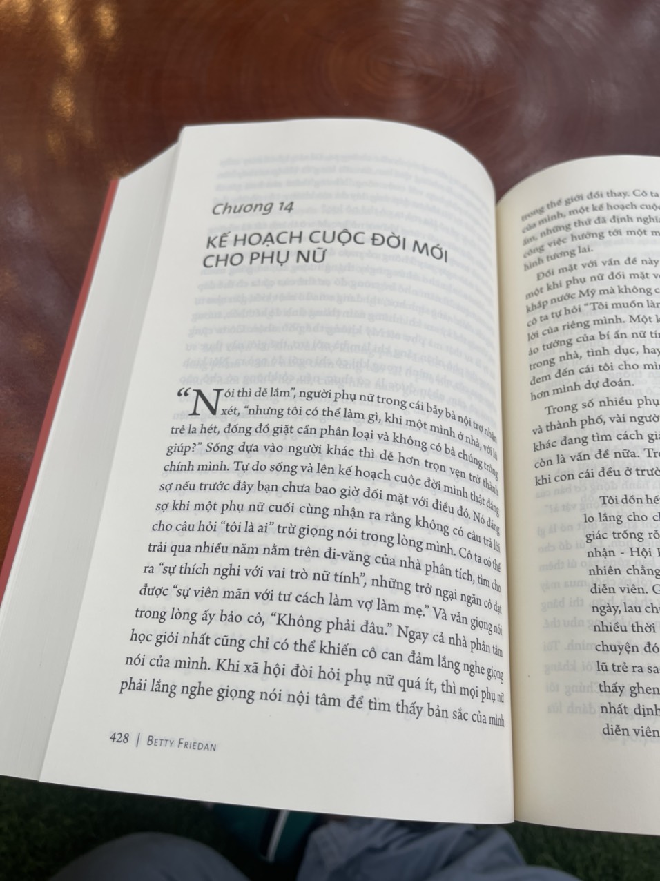 Đọc đến đây, nữ độc giả chúng ta mà cuộc đời được nền văn hóa Á Đông phủ bóng, hẳn thoáng giật mình. Nhưng, Betty Friedan không kêu gọi từ bỏ gia đình, hay hơn thua giành quyền với đàn ông, bà khao khát phụ nữ bước ra xã hội, có công việc, tự do sáng tạo, đạt được học vấn sâu rộng tối đa trong lĩnh vực mình yêu thích.