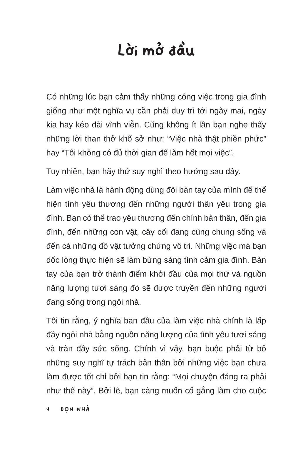 Điều kỳ diệu này được chứng minh qua 6 chương sách trong cuốn DỌN NHÀ của Kamoya Maki, đem đến cho bạn một tư duy hoàn toàn mới về việc “dọn nhà” hay những “công việc gia đình” nói chung. Thông qua những phương pháp tự nhiên không hề gò ép, bạn không chỉ buông bỏ những gánh nặng về trách nhiệm việc nhà mà còn học được cách truyền nguồn năng lượng yêu thương đến chính bản thân, gia đình, con vật hoặc đồ vật tưởng chừng như vô tri. Khi mọi thứ thuận theo dòng chảy của riêng chúng, những việc mà bạn dốc lòng thực hiện sẽ làm bừng sáng tình cảm gia đình. Bàn tay của bạn trở thành điểm khởi đầu của mọi thứ và nguồn năng lượng tươi sáng đó sẽ được truyền đến những người sống trong và ngoài ngôi nhà.