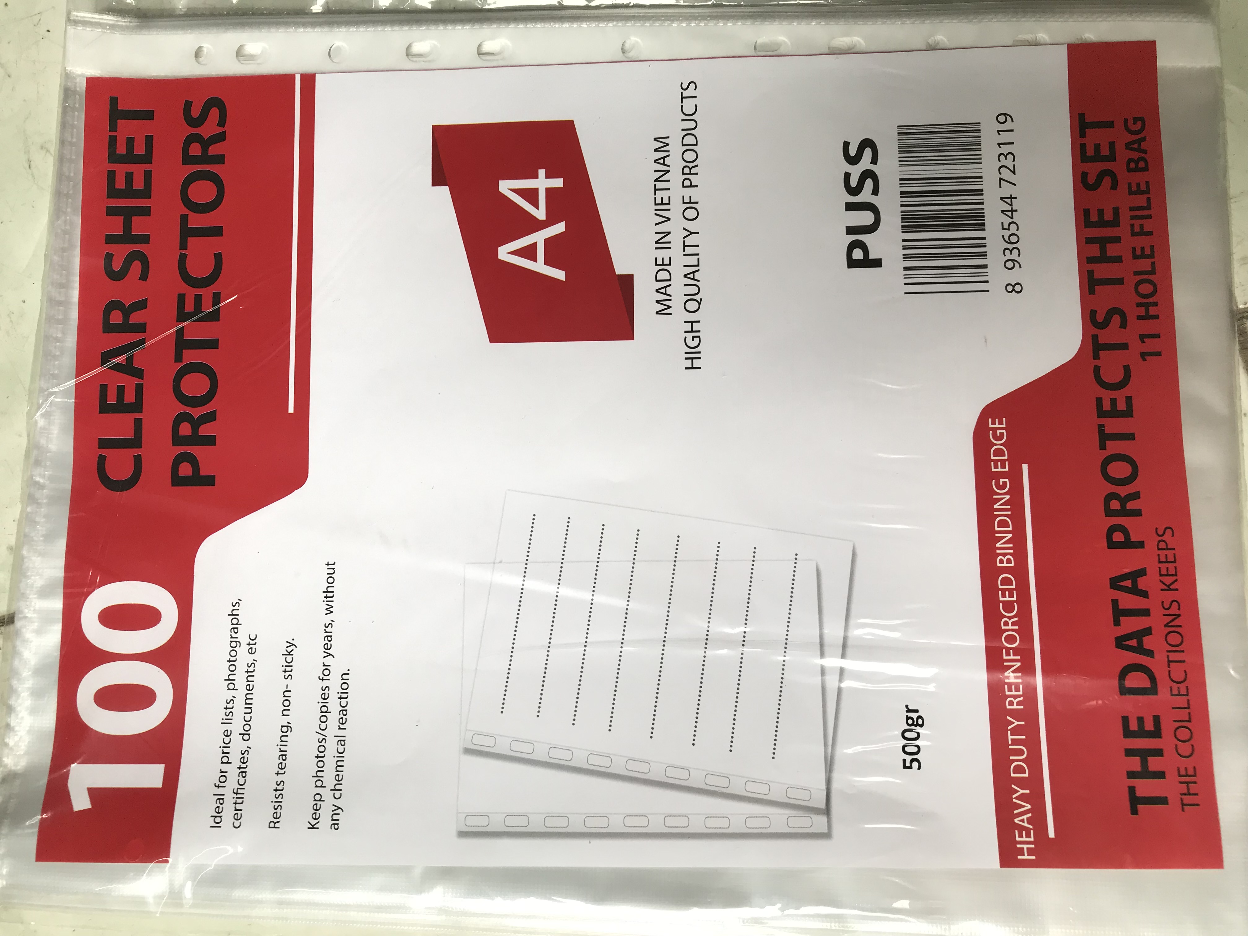 Bìa lỗ A4 400g: Được làm bằng nhựa PP, trong suốt, chống thấm nước, giúp bảo quản giấy tờ, hồ sơ sạch và an toàn. Dùng để lưu trữ và bảo quản các loại giấy