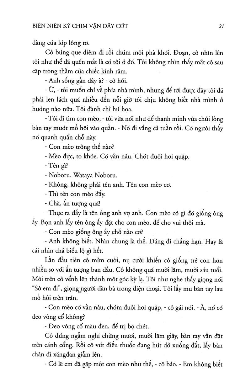 Câu chuyện đưa ta đến nước Nhật thời hiện đại, với những thân phận con người bé nhỏ, lạ lùng. Những cô bé 15 tuổi, như Kasahara May, ngồi sau xe môtô phóng với tốc độ kinh hoàng, vươn tay bịt mắt bạn trai phía trước. Sau tai nạn, bạn trai qua đời, chỉ còn lại mình cô với nỗi day dứt khôn nguôi: "Chính vì có cái chết, người ta mới phải băn khoăn nhiều đến thế về sự sống." Những thiếu nữ, như Kano Kreta, tự kết liễu đời mình để giải thoát những cơn đau triền miên có thể gặp phải bất cứ lúc nào, vì bất cứ điều gì nhưng không thành. Phải trả nợ một khoản tiền lớn cho hãng bảo hiểm, không do dự, cô đi làm gái điếm. Những Dân biểu nghị viên như Wataya Noburu, leo cao trong danh vọng nhờ tài lừa dối đám đông và khả năng khơi dậy những bản năng sa đọa ở người khá Trong thế giới ấy, nhân vật chính của Biên Niên Ký Chim Vặn Dây Cót, Okada Toru, chàng trai giản dị và chân thành, phải đối mặt với biến cố lạ lùng: Kumiko, người vợ yêu dấu của anh bỗng nhiên biến mất không một lời nhắn gửi. Sự kiện phi lý này khơi nguồn cho sự thức tỉnh trong Okada, thúc đẩy anh ngắm nhìn, chứng nghiệm lại thế giới tràn đầy cái phi lý chung quanh mình, bằng con mắt bản thể.