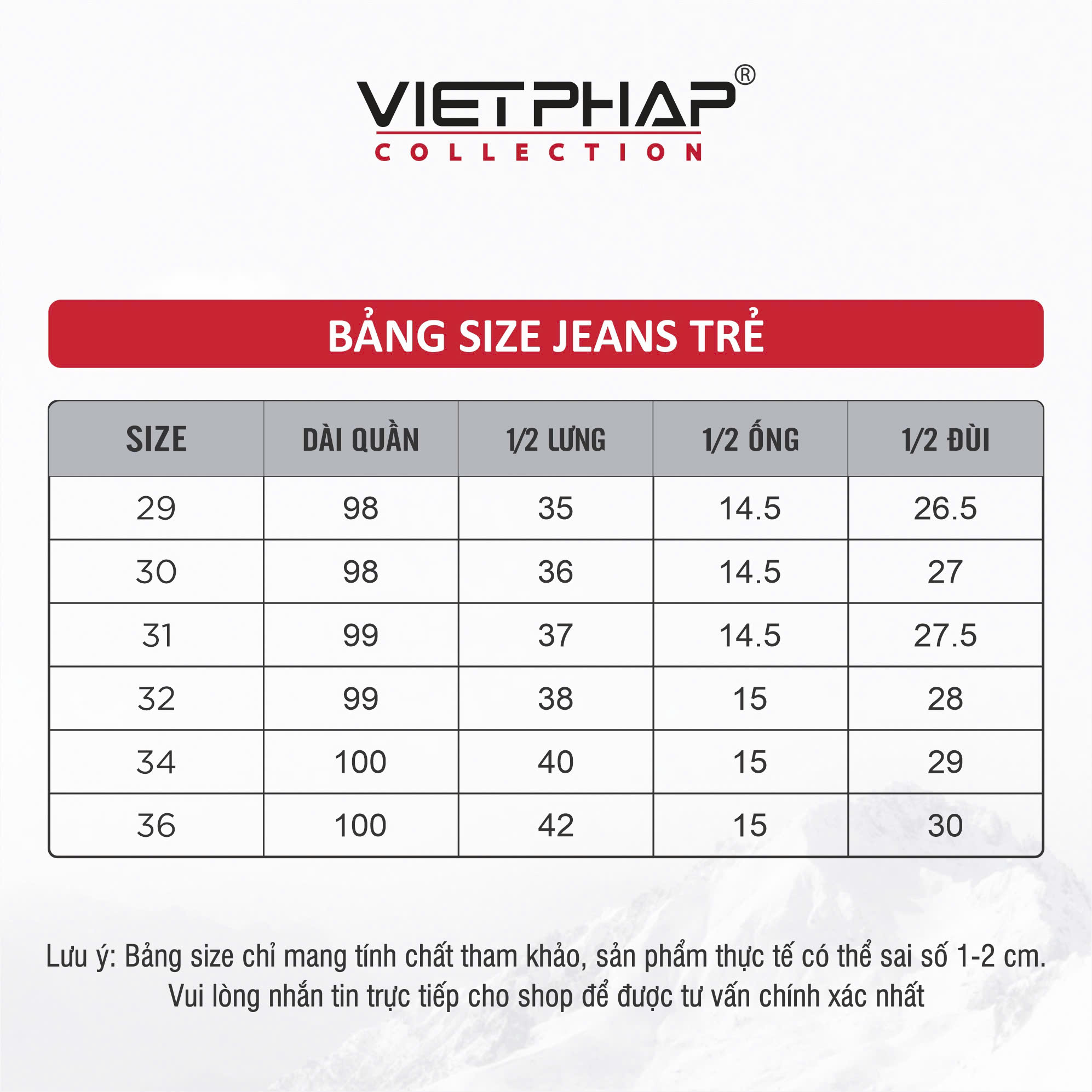Quần Jeans Cotton VIỆT PHÁP - Chất liệu: 100% Cotton - Size: 29 - 30 - 31 - 32 - 34 - 36 - Màu: 3 màu - Kiểu dáng: Thiết kế đơn giản