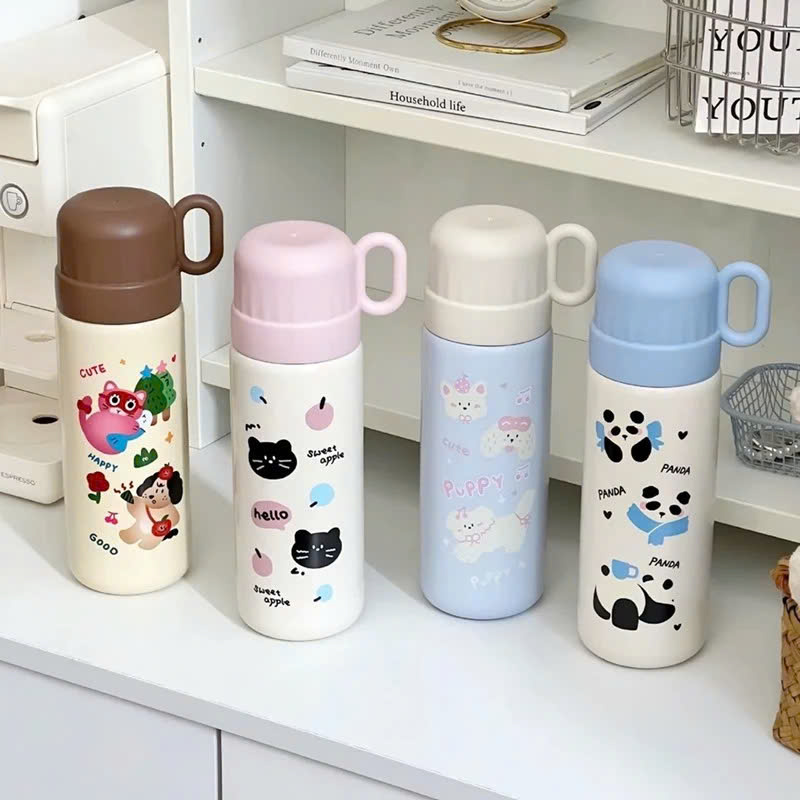 • Phong cách hoạt hình dễ thương: Bình giữ nhiệt có nhiều màu sắc trẻ trung, bao gồm trắng sữa, nâu đất, hồng cam và xanh dương, cùng thiết kế hoạt hình dễ thương, phù hợp với nhiều lứa tuổi và phong cách.