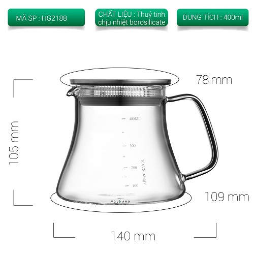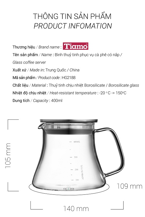 Bình phục vụ cà phê thủy tinh chịu nhiệt Tiamo 400ml nắp inox Dung tích 400ML Chất liệu: thủy tinh chịu nhiệt Borosilicate Nhiệt độ chịu nhiệt: 20 - 150 độ C Xuất xứ: Trung