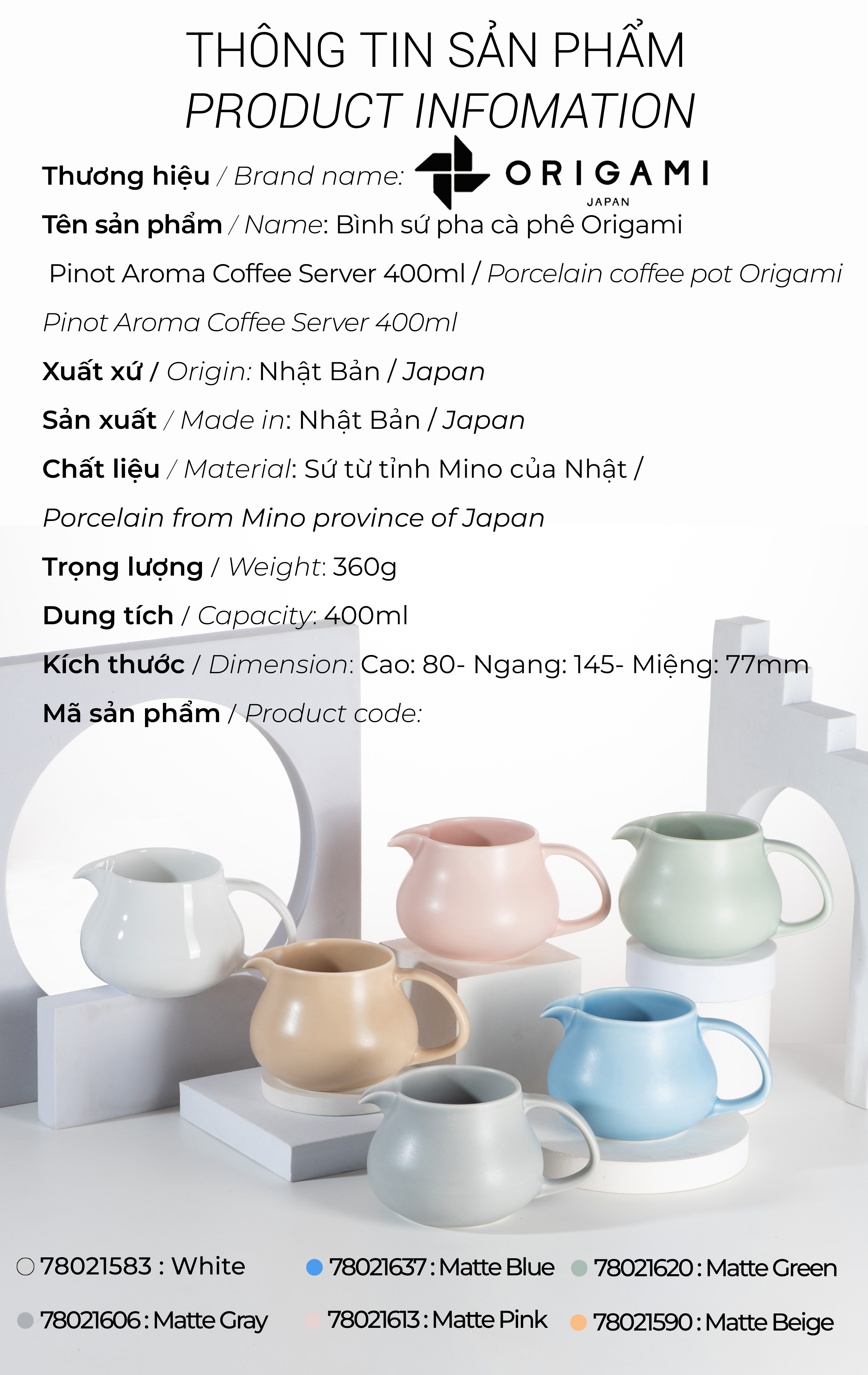 BÌNH SỨ PHA CÀ PHÊ ORIGAMI PINOT AROMA COFFEE SERVER 400ML Server Aroma nằm trong series các phụ kiện pha cà phê Pour Over của Origami – hướng tới sự đồng bộ về màu sắc