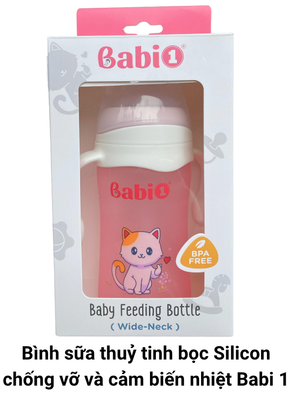 Chi tiết sản phẩm: Bình Sữa Thuỷ Tinh Babi1 Cổ Rộng Tráng Bọc Silicon Chống Vỡ Và Cảm Biến Nhiệt Độ - Dung tích 240ml Cho trẻ từ 12 tháng tuổi