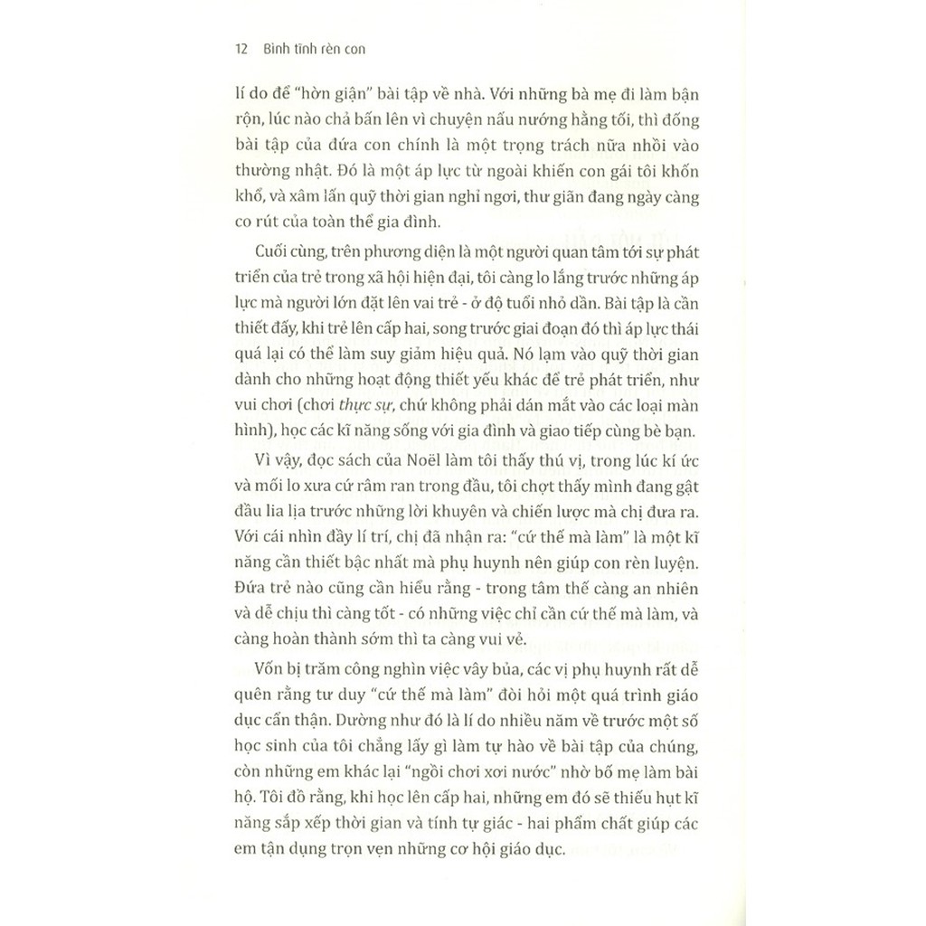 - Kiên trì và nhất quán Bạn có thể thay đổi cả những khía cạnh gây nản lòng nhất của việc làm cha mẹ, cải thiện vấn đề hành vi của “những thiên thần nổi loạn” để đạt được sự hợp tác tổi đa của trẻ trong mọi phương diện từ ăn uống, việc nhà, thời lượng trước màn hình công nghệ, điện tử, học hành, mối quan hệ giữa các anh chị em ruộ từ đó tạo dựng một cuộc sống gia đình êm đềm, thư thái và bình an! Với những chiến lược cốt lõi, tác giả giúp các bậc làm cha mẹ nhận diện rõ điều khiến việc làm cha mẹ thời nay trở nên căng thẳng, “xì-trét” cũng như giải pháp có thể áp dụng để giải quyết các vấn đề gây “bùng nổ” đó. Ở cuốn sách này, tác giả tập trung làm rõ mối quan hệ tương hỗ giữa gia đình và nhà trường, cũng như vai trò của từng đối tượng là cha mẹ, học sinh và giáo viên trong hoạt động giáo dục, đồng thời chỉ ra nguyên do, ý nghĩa cũng như vai trò của cha mẹ tại sao lại cần phải đảm trách, sát sao với việc học của con em mình, các giải pháp để cải thiện lối sống và thói quen đối với việc học. Tác giả nêu ra những sự khác biệt của các cậu bé cả về mặt sinh lý học lẫn cách nuôi dưỡng, và các bố mẹ muốn cuộc sống với cậu con trai của mình khác biệt ra sau, từ đó đưa ra những chiến lược với các bước hướng dẫn cụ thể, hiệu quả. Trong thời đại công nghệ thông tin và mạng xã hội phát triển chóng mặt như hiện nay, nhiều gia đang đang phải vật lộn với những vấn đề cực đoan hoặc không điển hình đến từ việc sử dụng thiết bị công nghệ, điện tử trong gia đình của các thành viên, từ cha mẹ đến con cái. Thấu hiểu và chia sẻ với gánh nặng và sự đau đầu của các cha mẹ, tác giả đã nêu ra bốn vấn đề, cũng như tác động tiêu cực của việc sử dụng thiết bị điện tử, nguyên nhân tại sao thiết bị điện tử lại gây nghiện với trẻ tuổi teen và tuổi tiền dậy thì, thậm chí cả trẻ nhỏ đến như vậy, đồng thời vạch ra một chiến lược giúp các bậc cha mẹ cần trở lại nắm quyền kiểm soát thời gian sử dụng các thiết bị điện tử, công nghệ trong gia đình. VỀ TÁC GIẢ Noel Janis-Norton tốt nghiệp ngành đào tạo giáo viên tại Đại học New York. Bà đã có hơn 40 năm là chuyên gia nghiên cứu về quá trình học tập và hành vi, đồng thời còn là một giáo viên trực tiếp đứng lớp, bên cạnh đó là một giáo viên – người cố vấn những nhu cầu chuyên biệt, một gia sư rất giàu kinh nghiệm về chiến lược học tập, một giáo viên chủ nhiệm, chuyên gia hỗ trợ hành trình làm cha mẹ. Noel là nhà sáng lập – giám đốc một trung tâm làm cha mẹ tại London, nơi chuyên mở những khoá học và tư vấn cho các vị phụ huynh có con ở lứa tuổi từ chập chững đến dậy thì. Ngoài việc là một diễn giả quen thuộc tại các hội nghị chuyên môn, Noel còn xuất hiện trên nhiều chương trình phát thanh và truyền hình xoay quanh chủ đề nuôi dạy con. Bên cạnh công việc giảng dạy trên khắp nước Anh và nước Mỹ, bà còn thường xuyên tập huấn cho đội ngũ giáo viên và những chuyên gia trong lĩnh vực làm cha mẹ theo phương pháp độc đáo và vô cùng hiệu quả của mình. Noel là người phát ngôn cho Tuần lễ Gia đình Quốc gia (Mỹ), đồng thời là chuyên gia tập huấn kĩ năng làm cha mẹ cho Macaroni Kid (một trang web nổi tiếng dành cho cha mẹ tại Mỹ). Nhờ những hội thảo, khoá học và sự kiện giao lưu dành cho các vị phụ huynh, thêm nữa là nhờ những cuốn sách, CD và DVD của bà, Noel đã góp tâm sức để thay đổi tích cực cuộc sống của hàng chục nghìn gia đình.