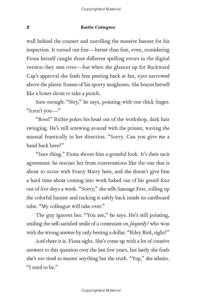 Against her better judgment, Fiona agrees to have lunch with Sam. What happens next takes them both by surprise. Sam is enthralled by Fiona’s take-no-prisoners attitude, and Fiona discovers a lovable goofball behind Sam’s close-up-ready face. Long drives to the beach, late nights at dive bars . . . theirs is the kind of kitschy romance Hollywood sells. But just like in the rom-coms Fiona despises, there’s a twist that threatens her new love. Sam doesn’t know the full story behind her breakdown. What happens when she reveals the truth?