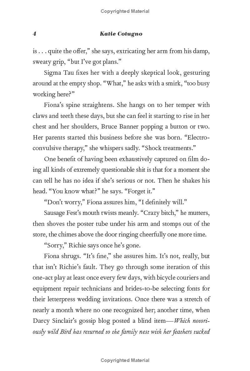 Unlike Fiona, Sam Fox, who played her older brother on the popular television show Birds of California, loves the perks that come with being a successful Hollywood actor: fame, women, parties, money. When his current show gets cancelled and his agent starts to avoid his calls, the desperate actor enthusiastically signs on for a Birds of California revival. But to make it happen, he needs Fiona St. James.