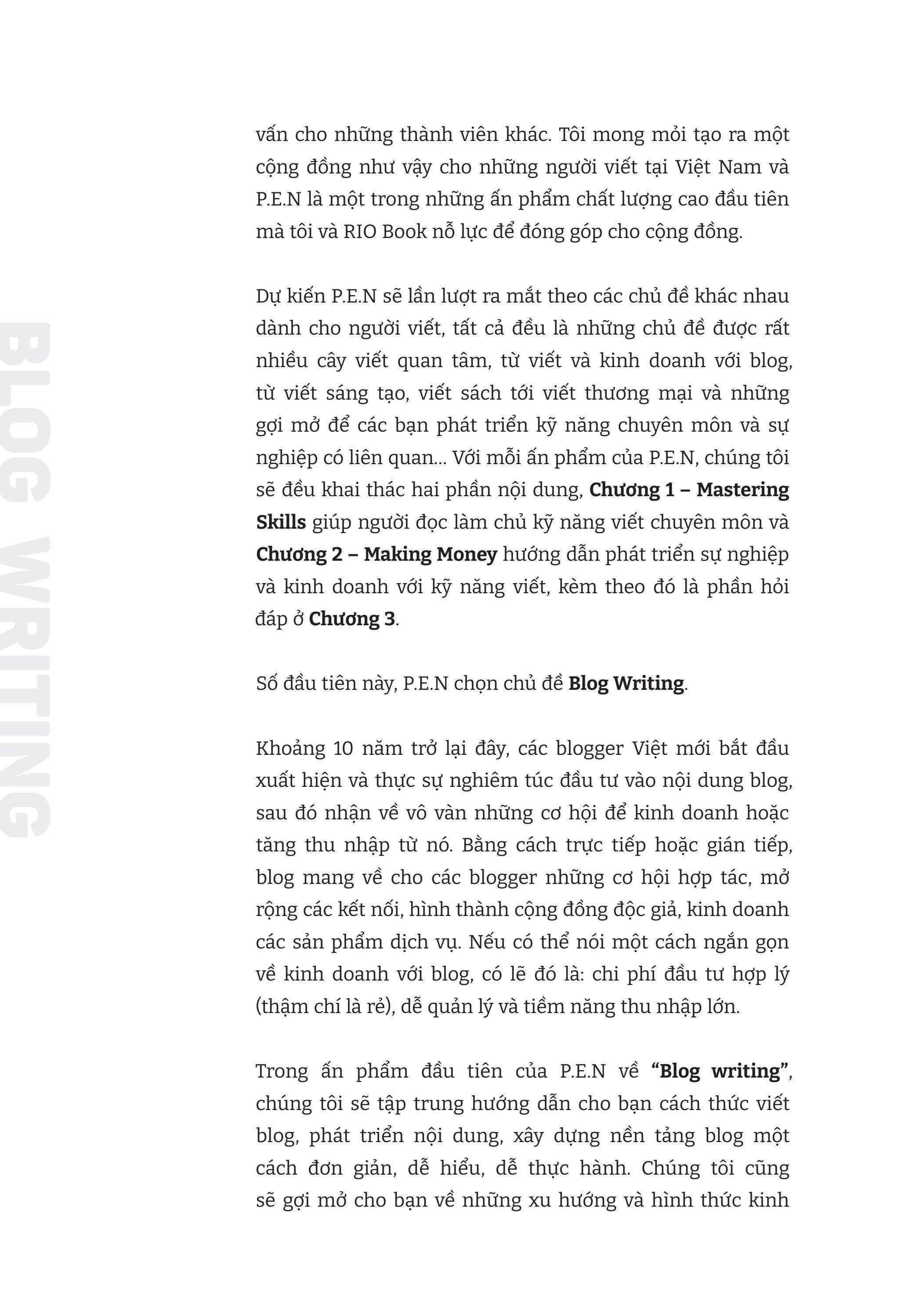 “BLOG WRITING - Sống với nghề viết blog" là số đầu tiên của P.E.N - Series ấn phẩm chuyên nghiệp đầu tiên dành cho người viết tại Việt Nam.
