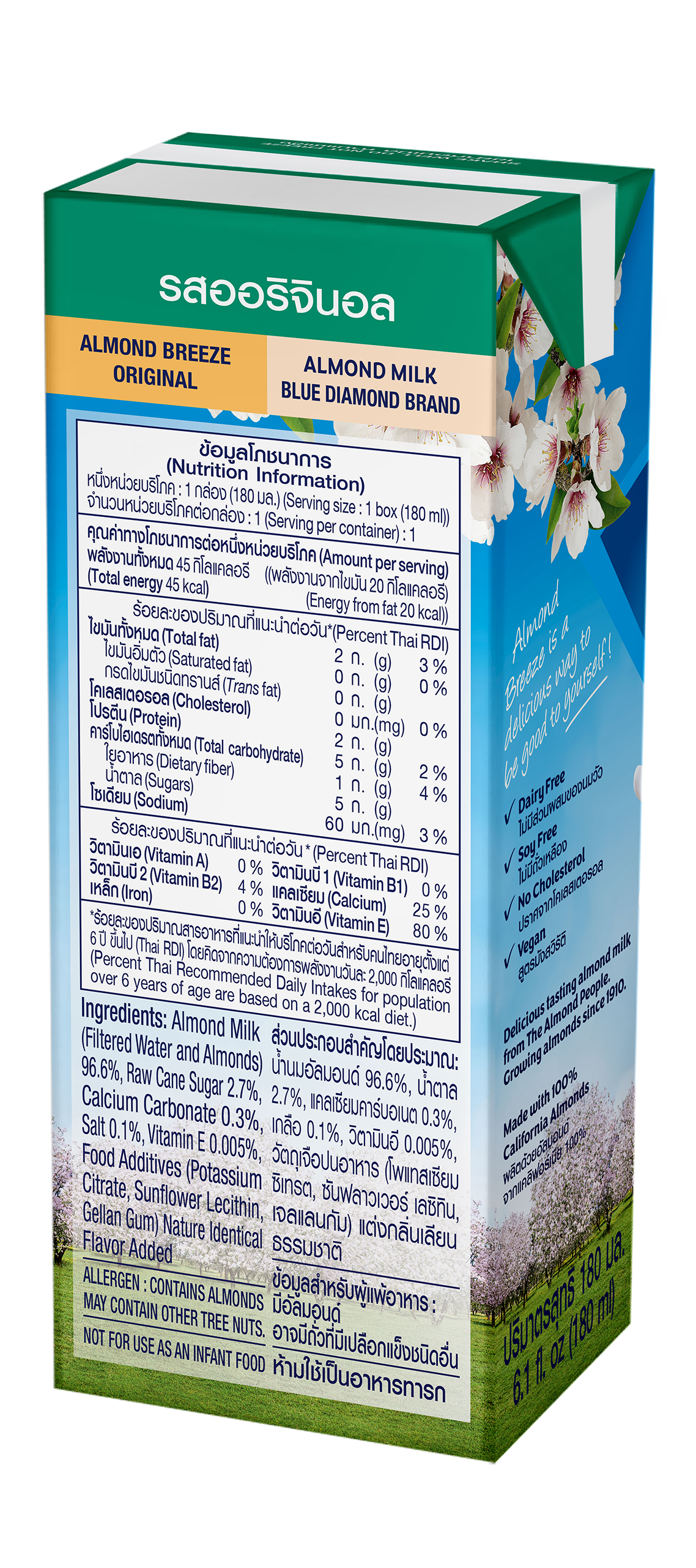 ALMOND BREZZE tự hào là sản phẩm sữa hạt hạnh nhân có SẢN LƯỢNG TIÊU THỤ SỐ 1 TẠI MỸ và vinh dự là SẢN PHẨM SỮA HẠT DUY NHẤT được phục vụ trong bữa chính TRÊN CHUYẾN BAY KHAI TRƯƠNG TRỰC TIẾP ĐẦU TIÊN VN98 TỪ VIỆT NAM SANG MỸ.   Sữa hạt hạnh nhân ALMOND BREEZE (Sản phẩm của Tập đoàn BLUE DIAMOND – Mỹ) là thức uống bổ dưỡng hàng ngày tốt cho sức khỏe. Đặc biệt THÍCH HỢP VỚI KHÁCH HÀNG BỊ DỊ ỨNG VÀ KHÔNG DUNG NẠP ĐƯỢC ĐƯỜNG SỮA (Lactose); những người ăn chay; phụ nữ mang thai và cho con bú với thành phần dưỡng chất giàu Canxi và Vitamin E; không Cholesterol và không chứa các thành phần từ đậu nành và sữa. Chiết xuất hạnh nhân lên đến 96,6% ALMOND BREEZE NGUYÊN CHẤT giúp bạn cảm nhận trọn vẹn tinh túy chất lượng hạnh nhân từ Mỹ. Sữa hạt hạnh nhân ALMOND BREEZE là sản phẩm sữa hạt tốt cho sức khỏe của bạn và gia đình bạn vì: