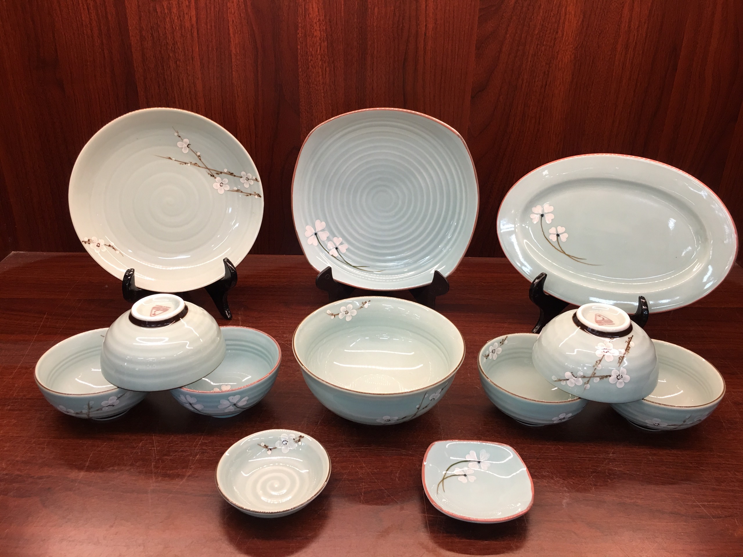 Bộ bát đĩa vẽ hoa đào xanh Bát Tràng