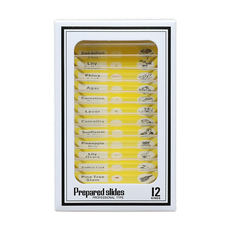 Tính năng: Bộ 12 loại mẫu vật động thực vật Được đóng gói trong một hộp trắng, mỗi mẫu được gắn nhãn với mẫu vật nhận dạng. Các mẫu được kín với một coverslip để